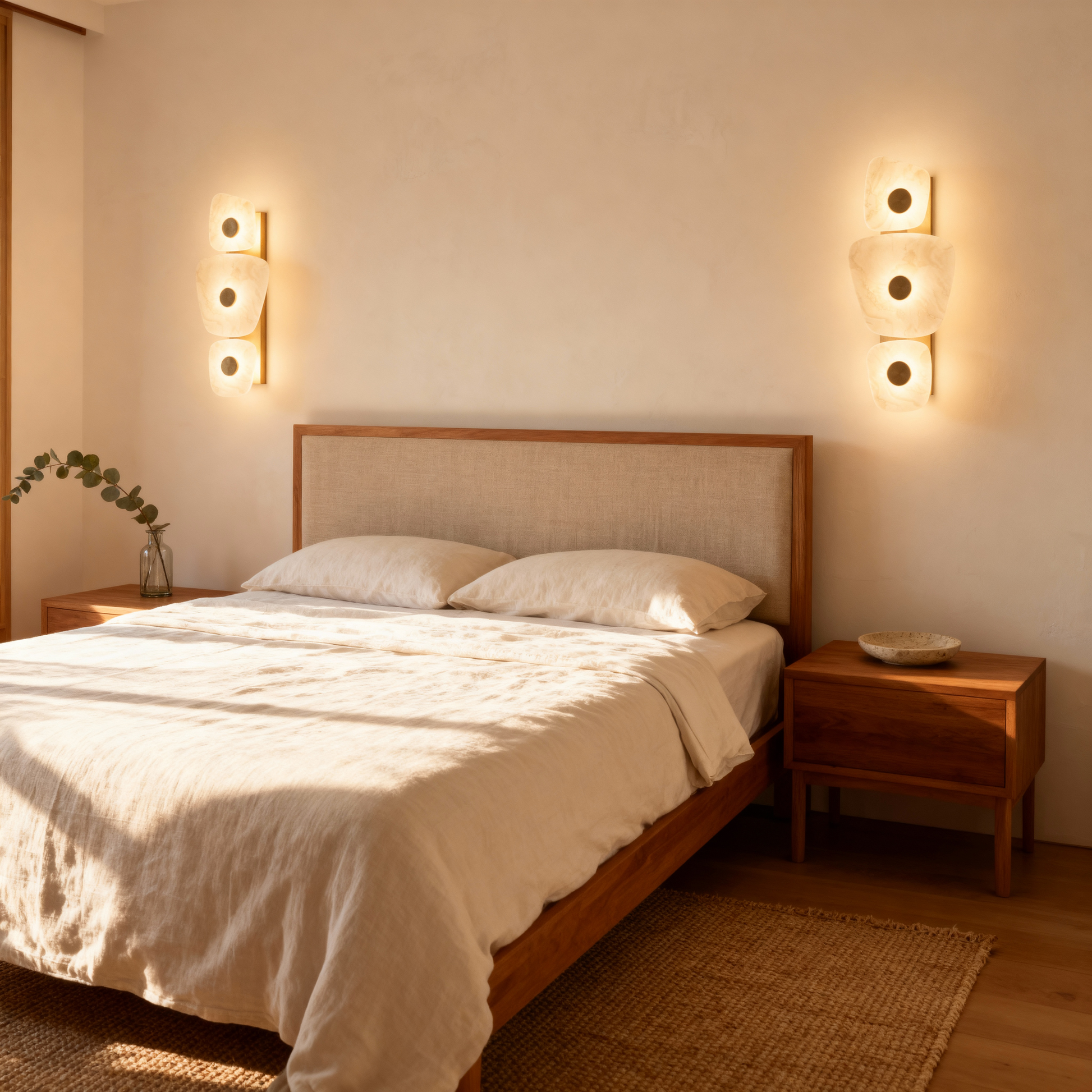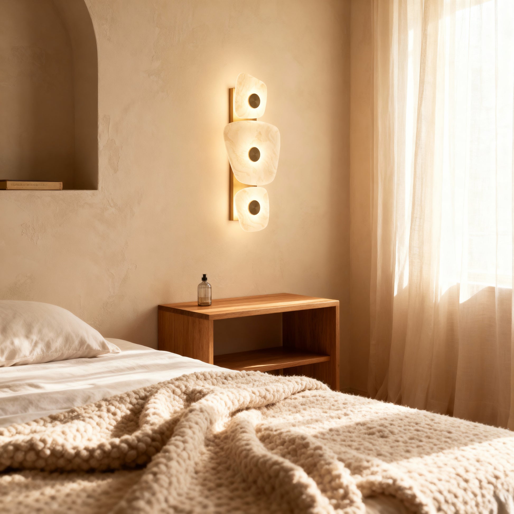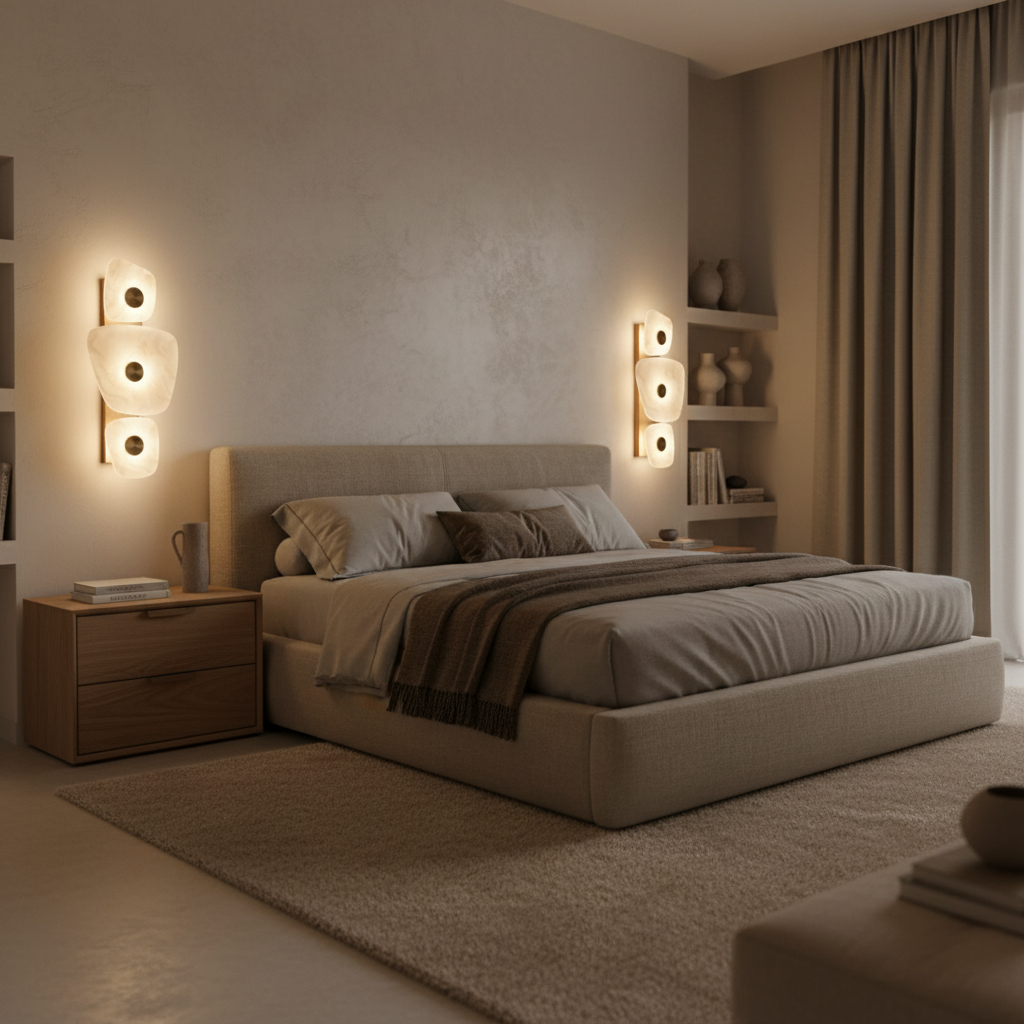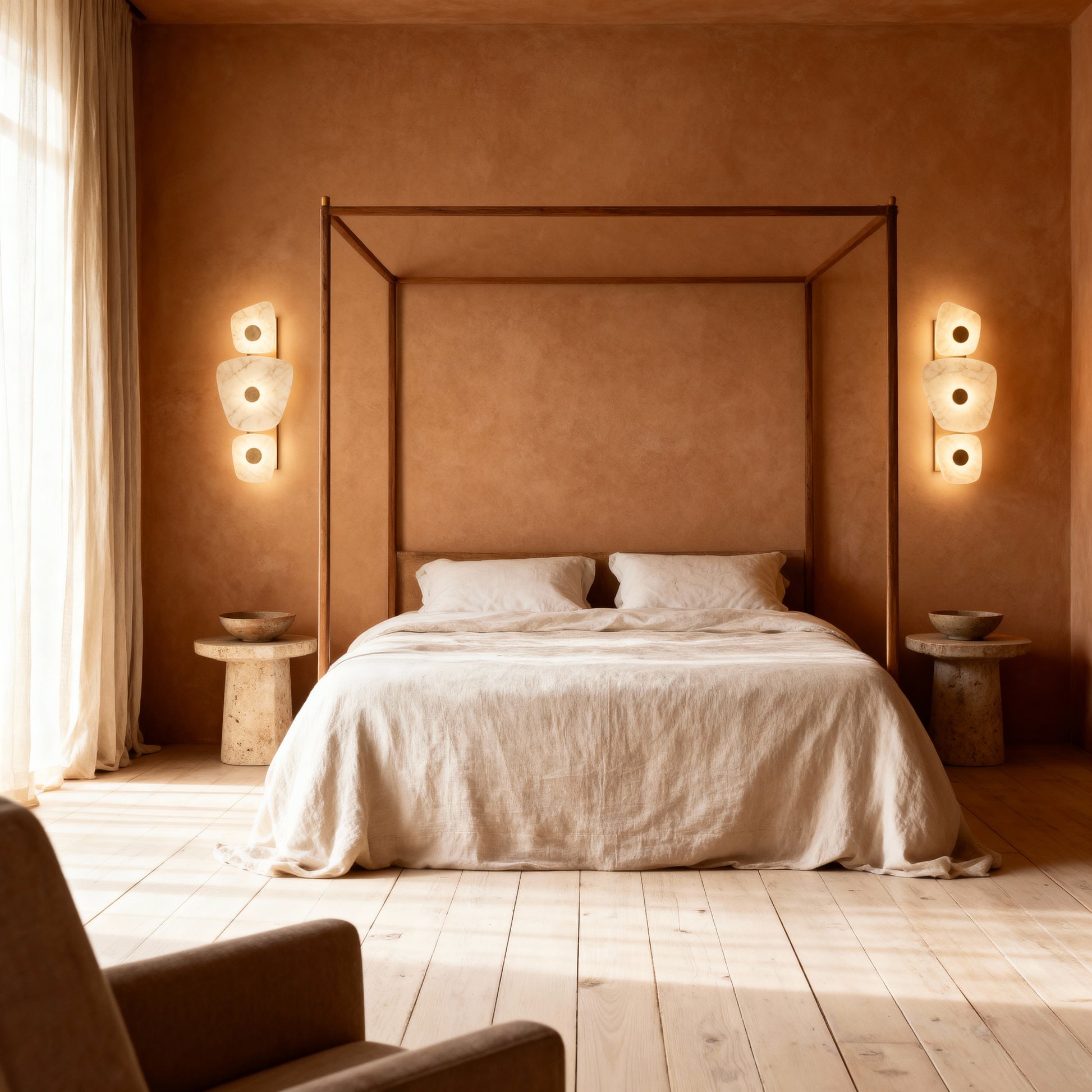Softly illuminated marble panels float against a metallic base, diffusing a warm, ambient glow. Pax blends sculptural balance with natural texture, making it a luminous focal point for contemporary living spaces.
