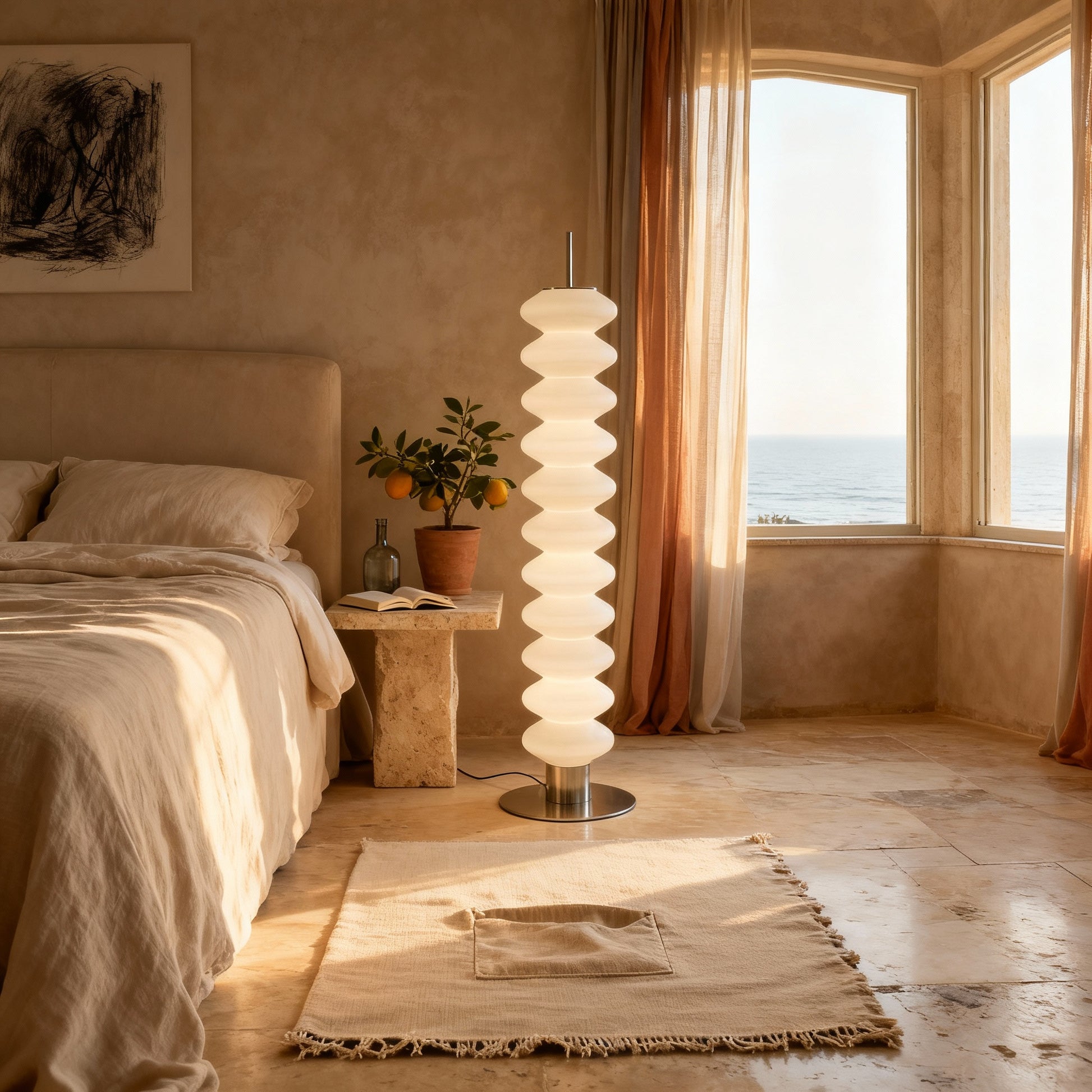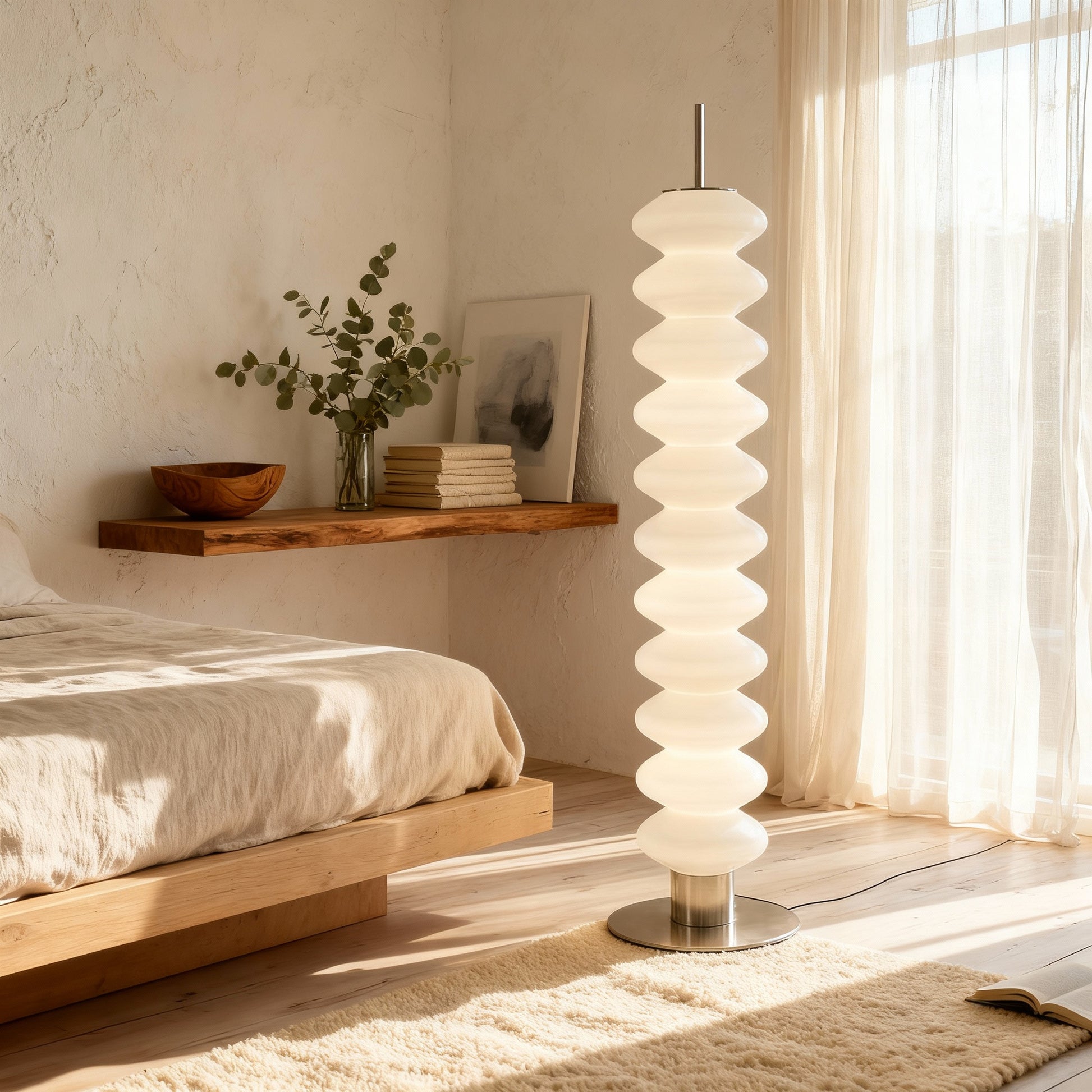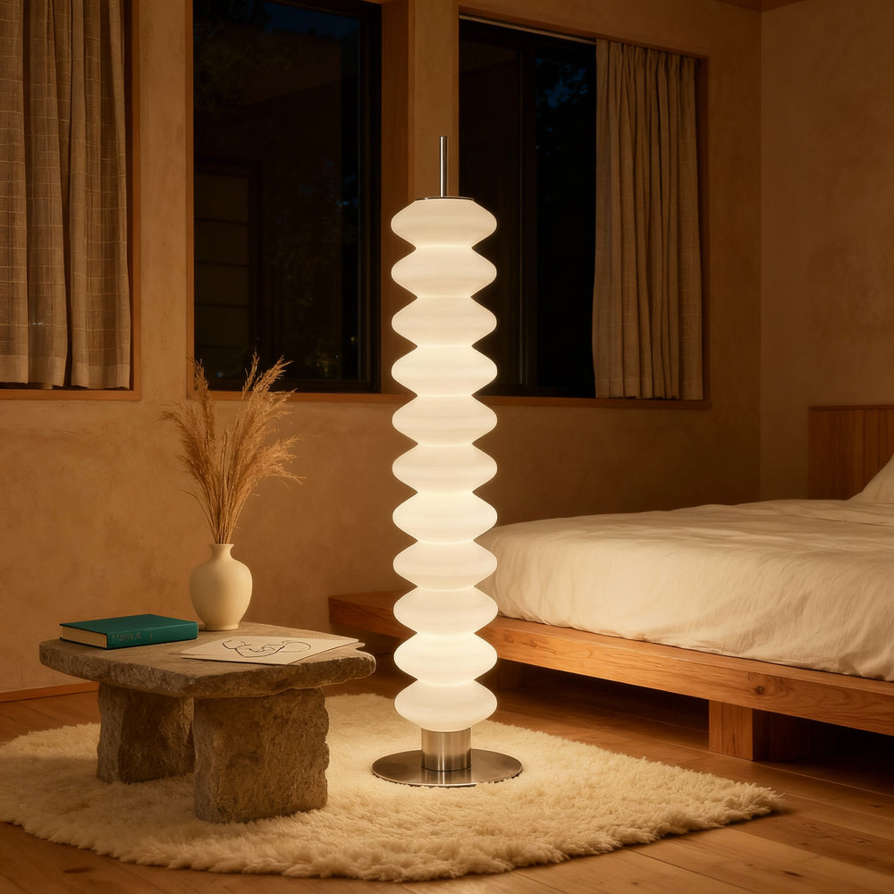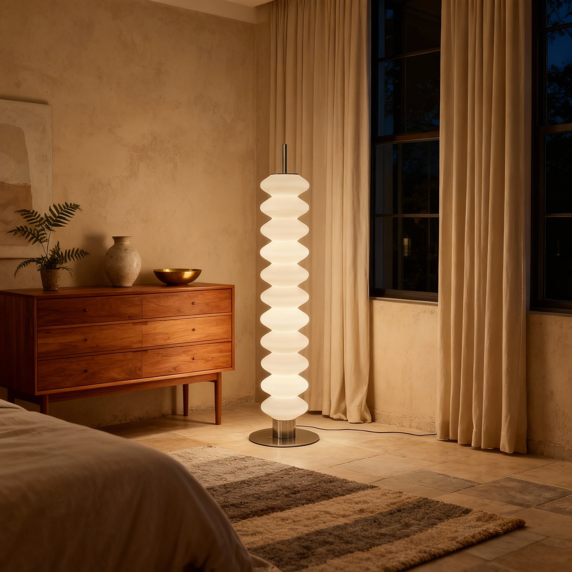 The layered contours distribute illumination smoothly, creating a warm ambient field. Its height and rhythmic geometry introduce sculptural order without overwhelming the space.