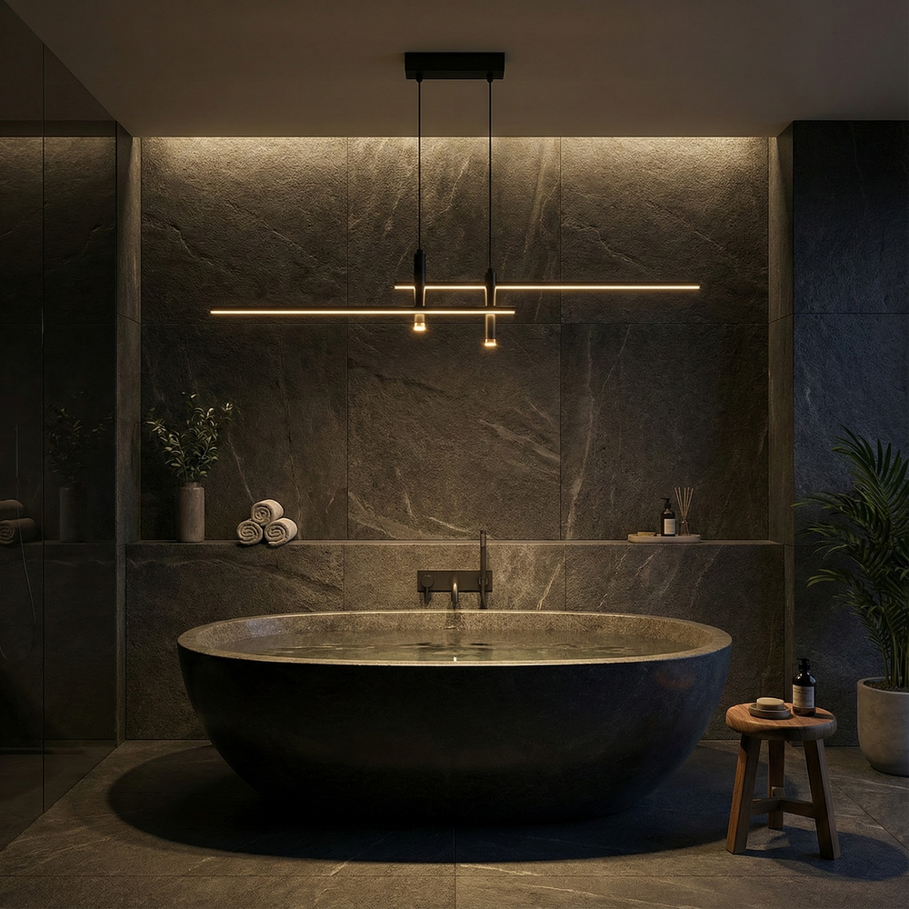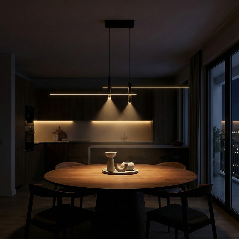 Suspended with precision, Raine introduces a sense of rhythm and order through its elongated horizontal form. The clean lines hover effortlessly in space, offering a composed visual anchor above dining areas or islands while maintaining an airy, architectural presence.