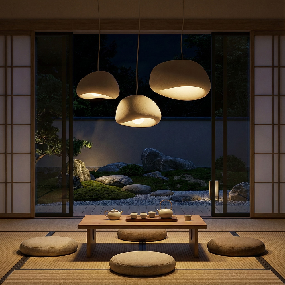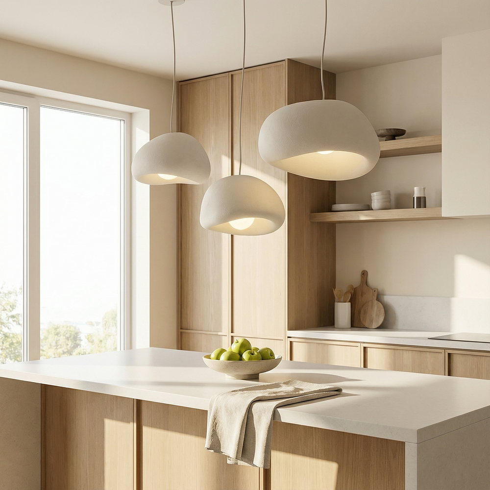 A sculptural pendant that balances Nordic simplicity with wabi-sabi softness for calm, modern interiors.