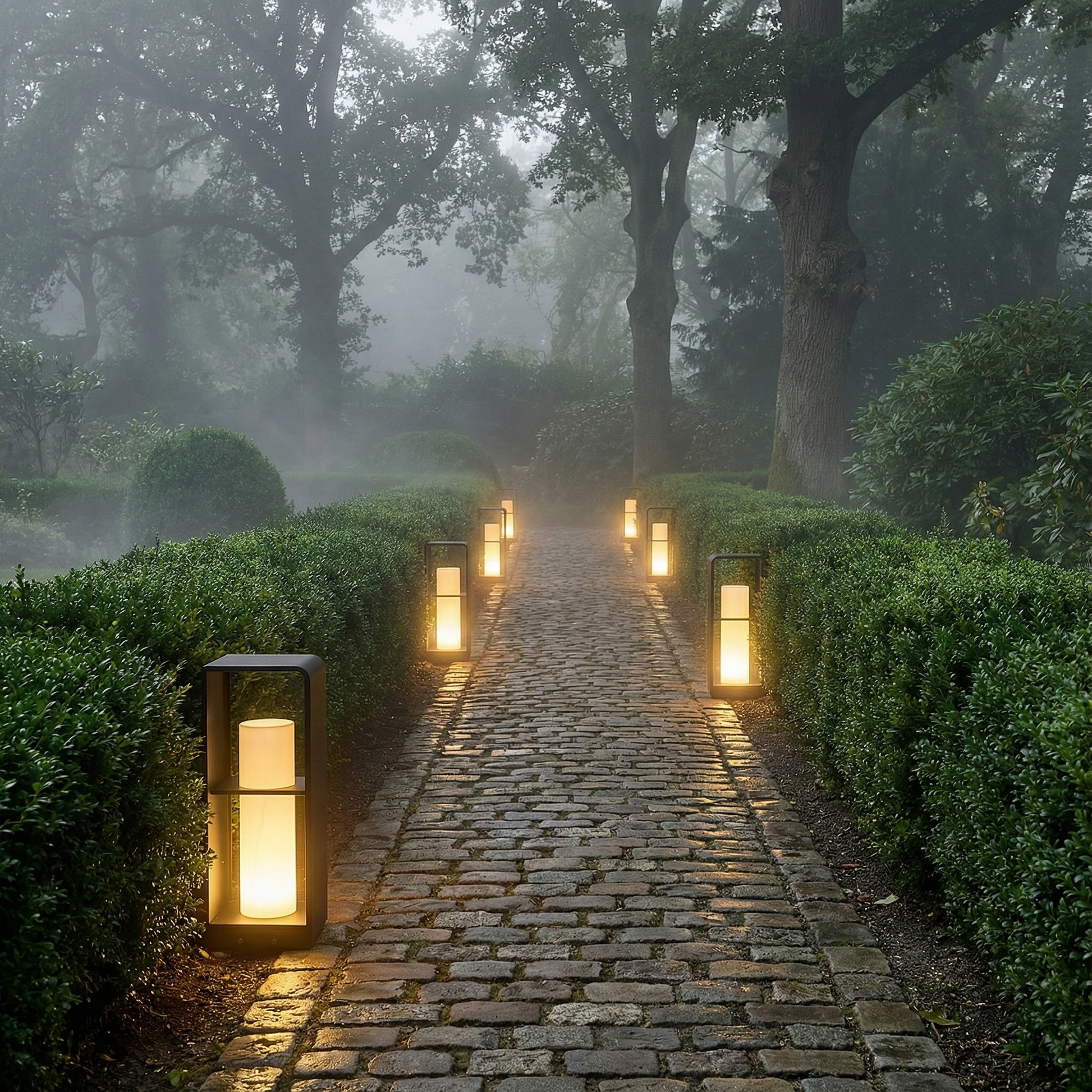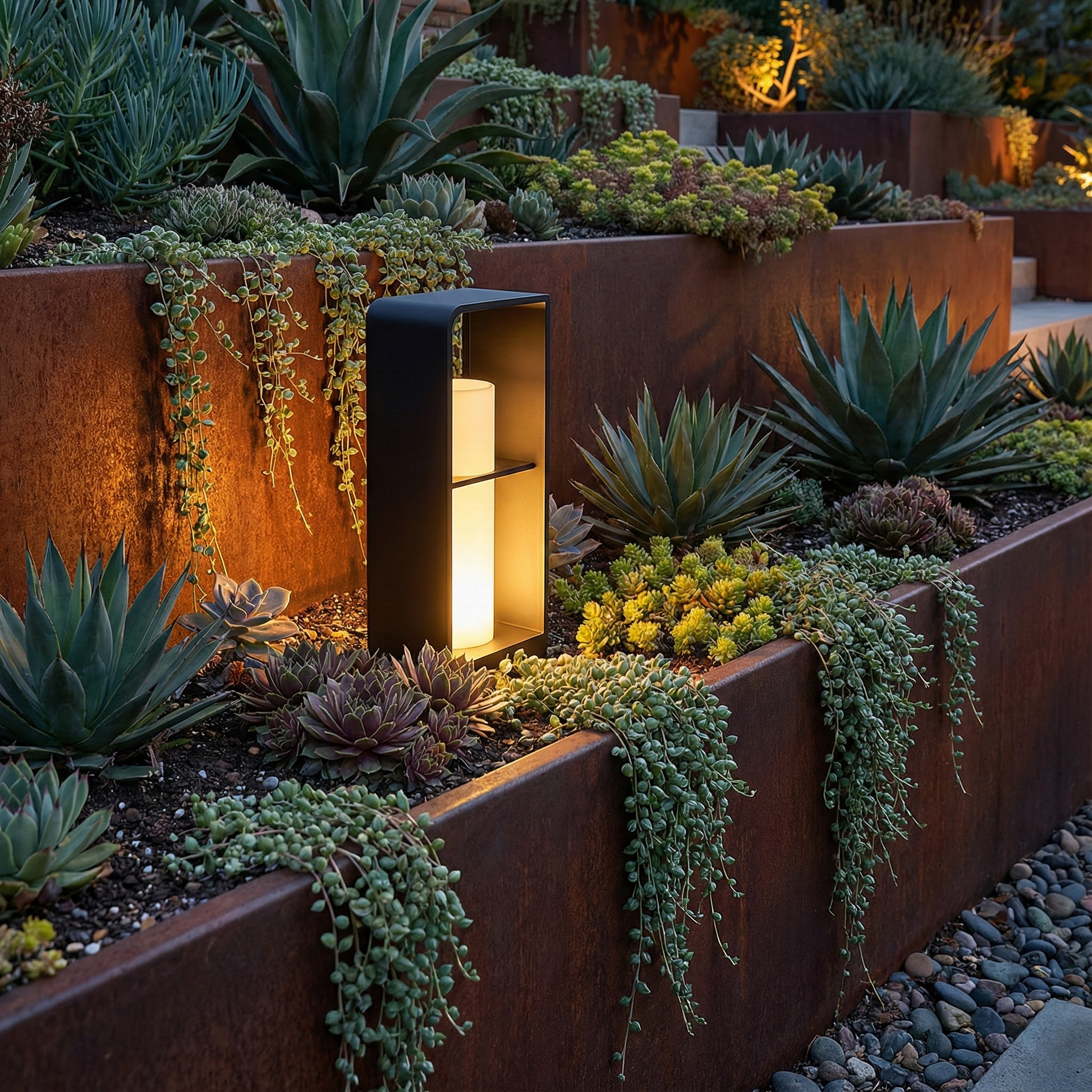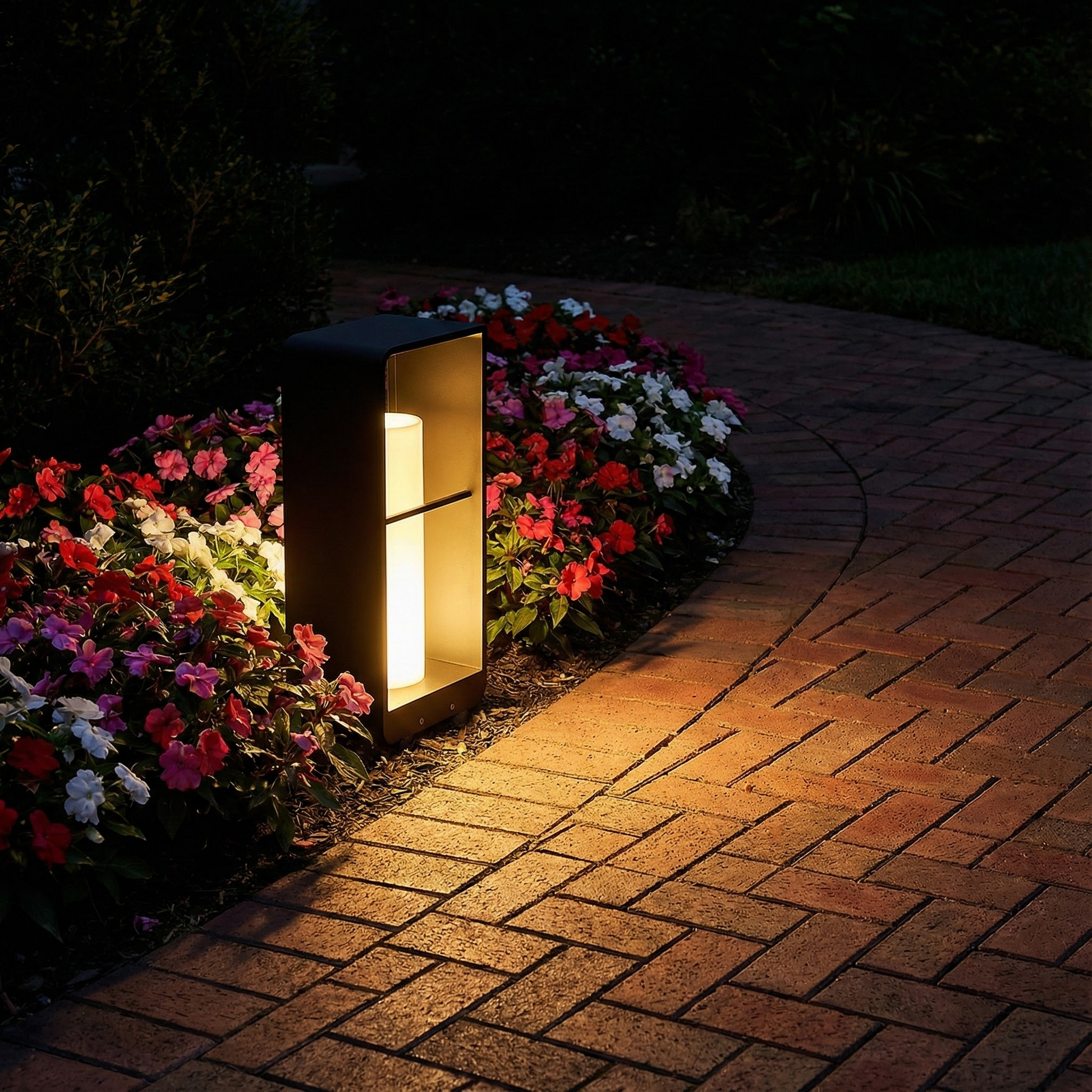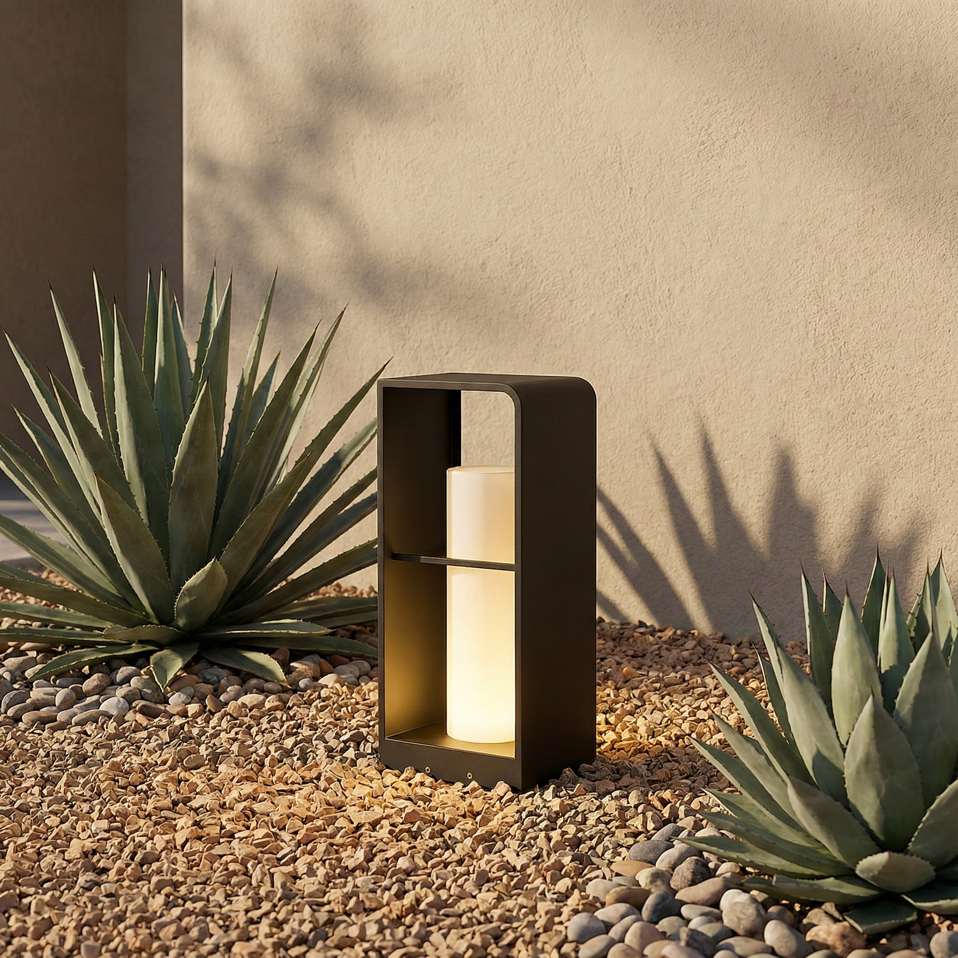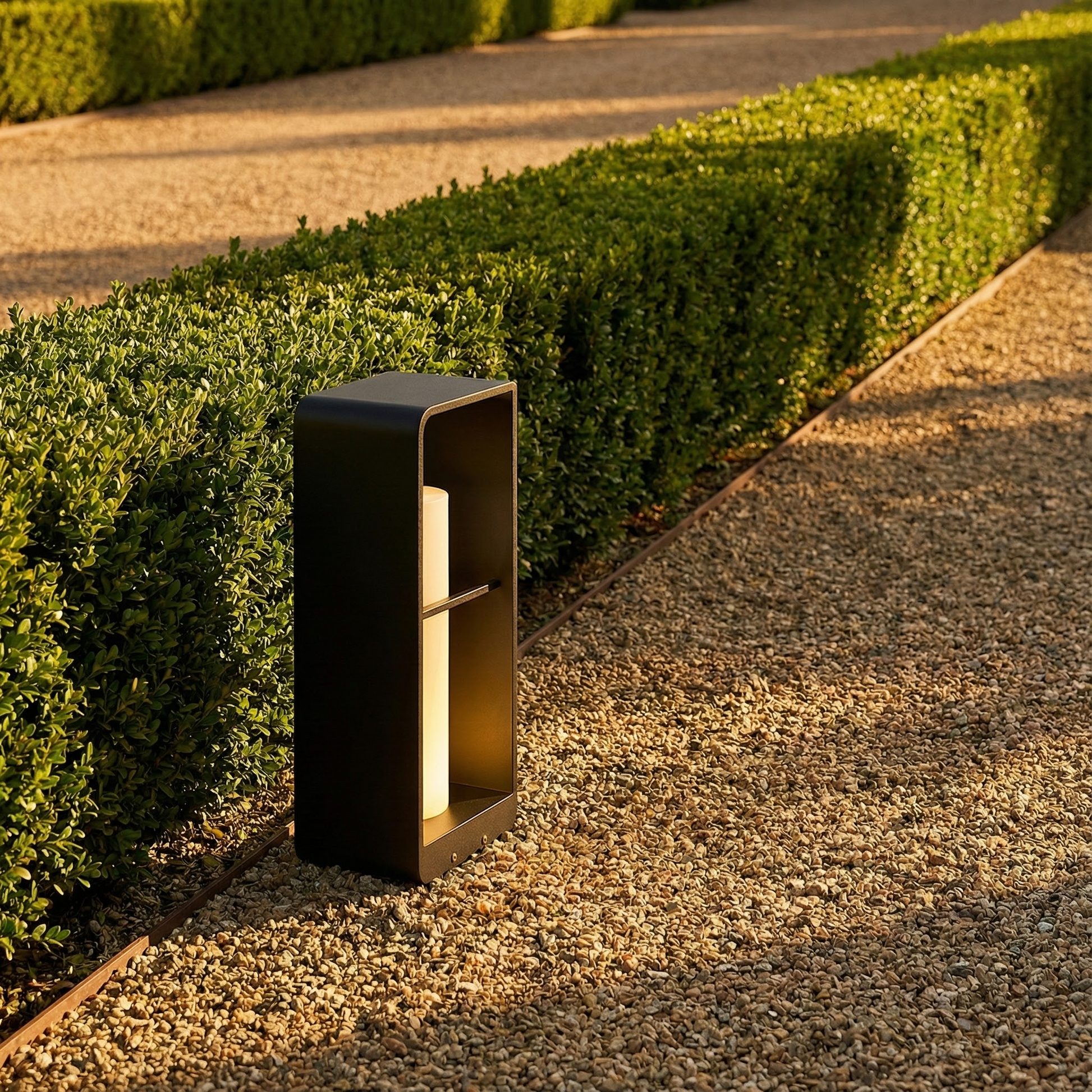With its clean silhouette and warm inner illumination, Sonne brings order and calm to outdoor pathways. The layered frame design creates depth and visual interest by day, while at night it delivers a composed ambient glow that enhances gardens and walkways without overpowering the landscape.