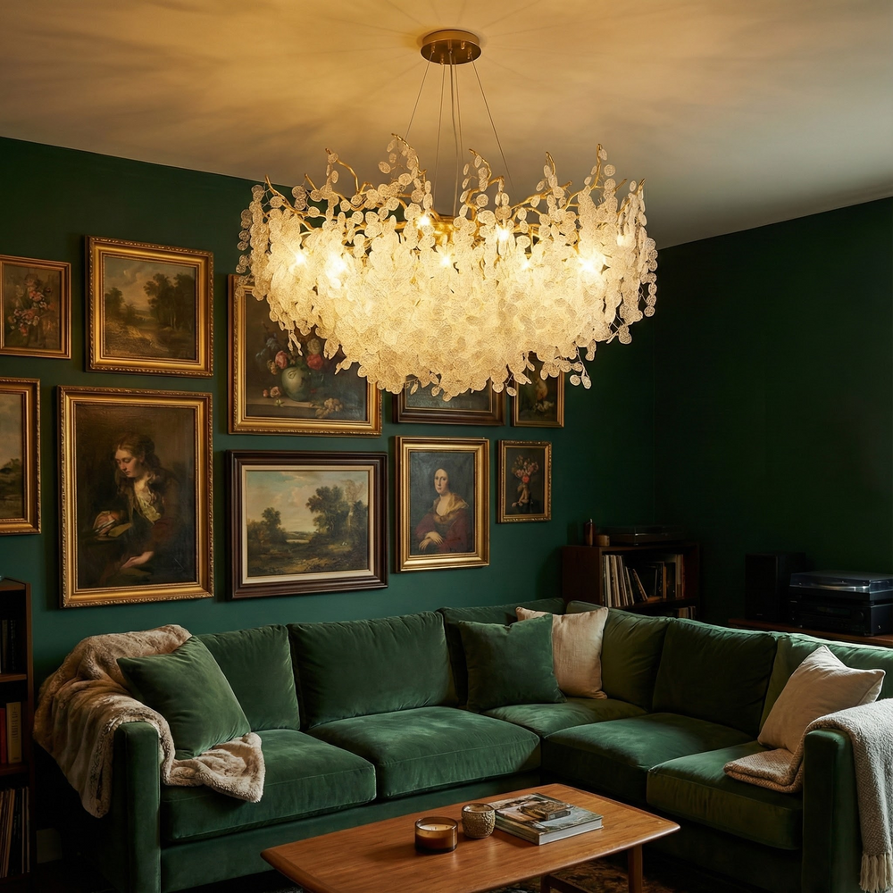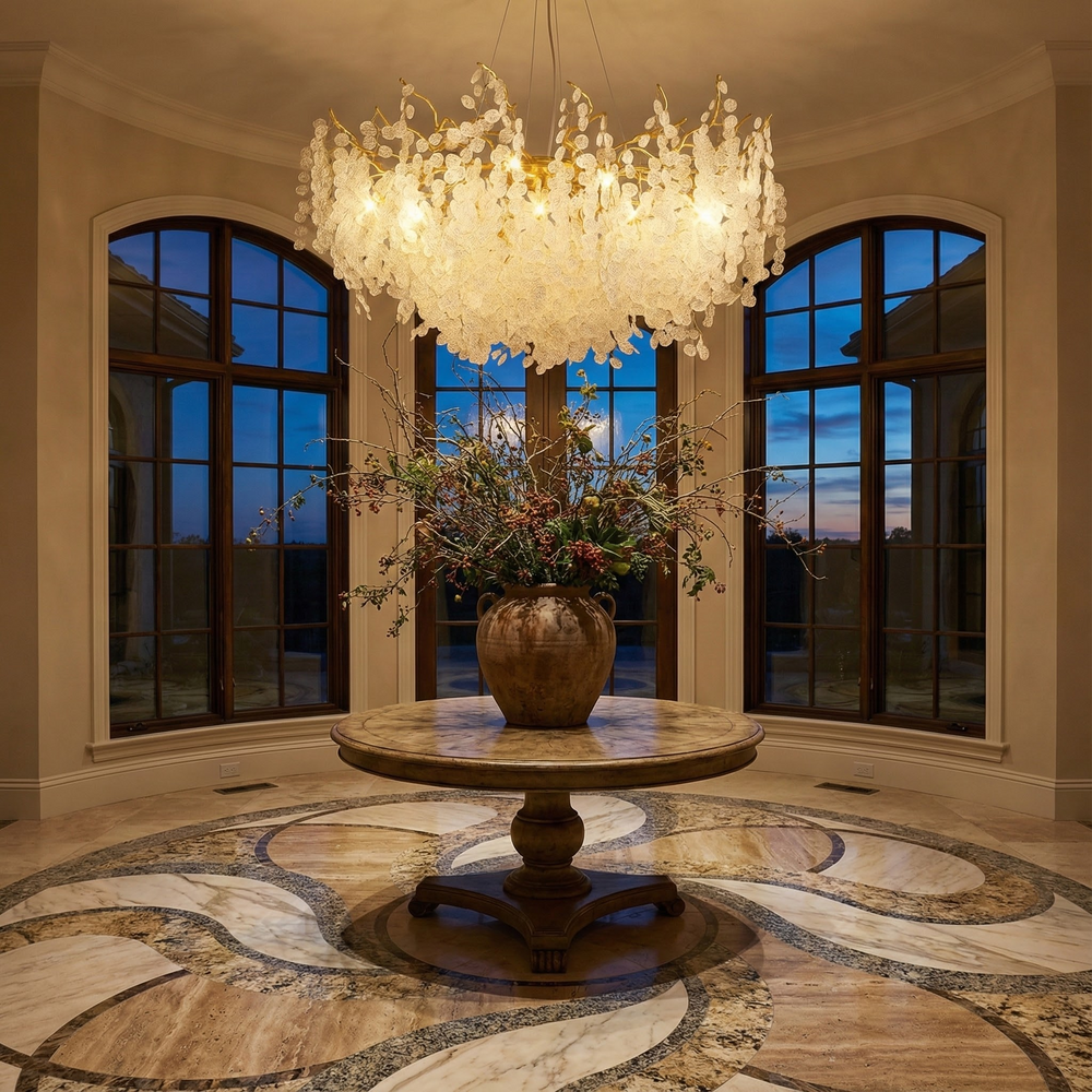 A contemporary chandelier that transforms expansive spaces with layered crystal texture and balanced ambient illumination.
