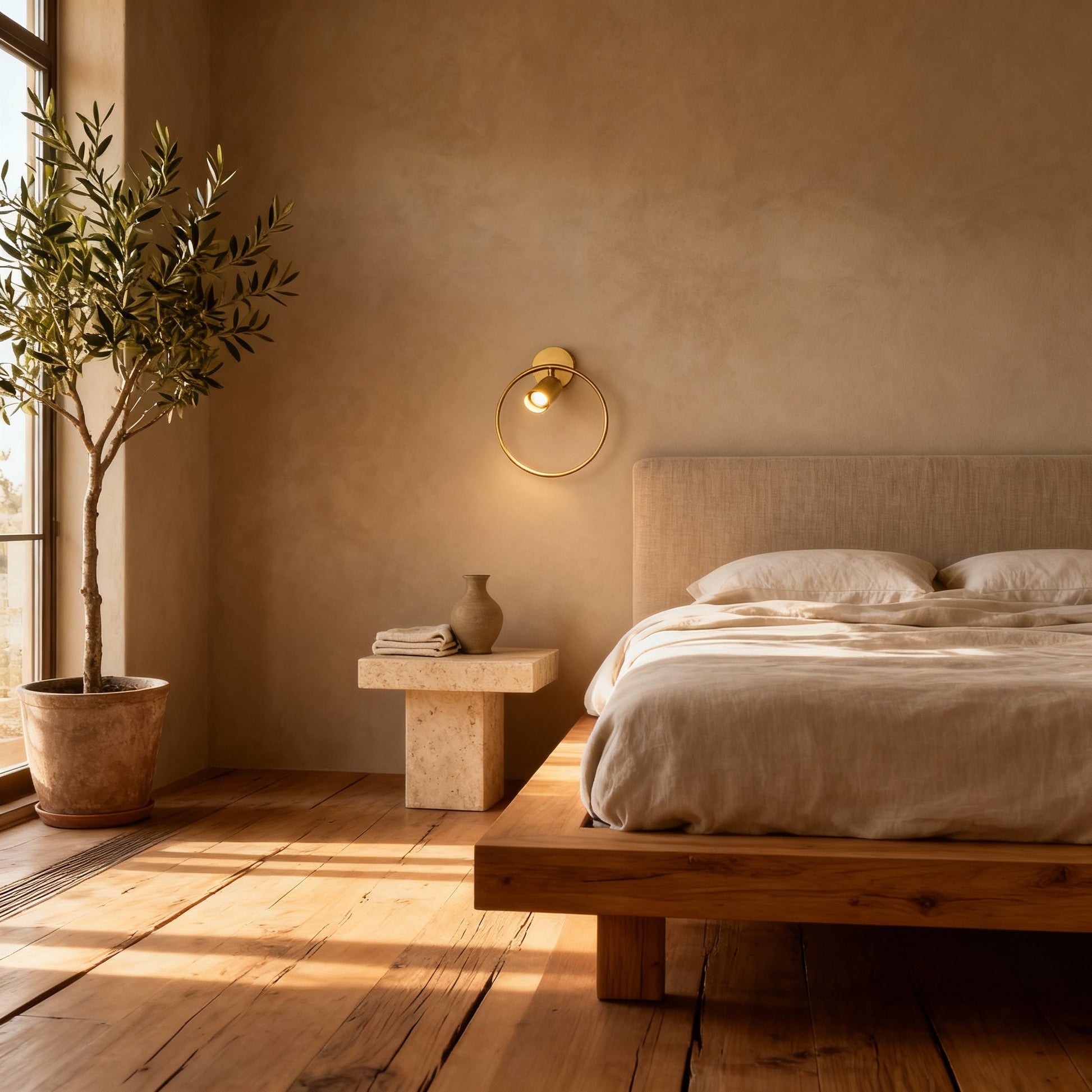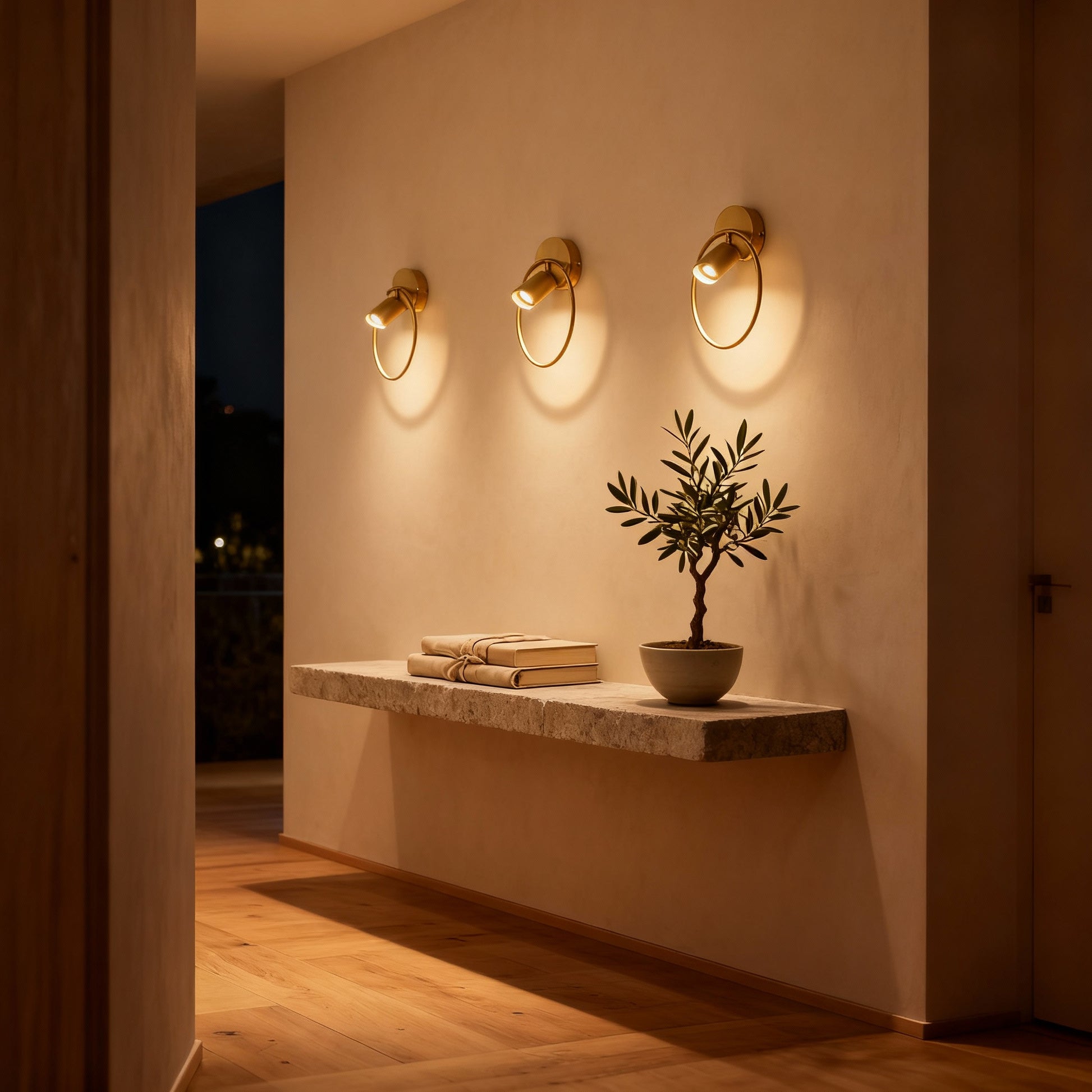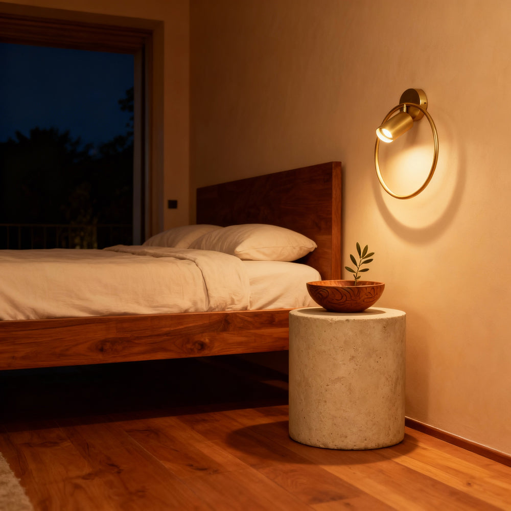 Taryn’s minimalist gold frame and adjustable spotlight create a soft, architectural play of light and shadow. Its clean form adds quiet sophistication to bedroom or hallway settings, balancing function with elegant design.