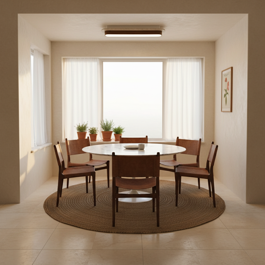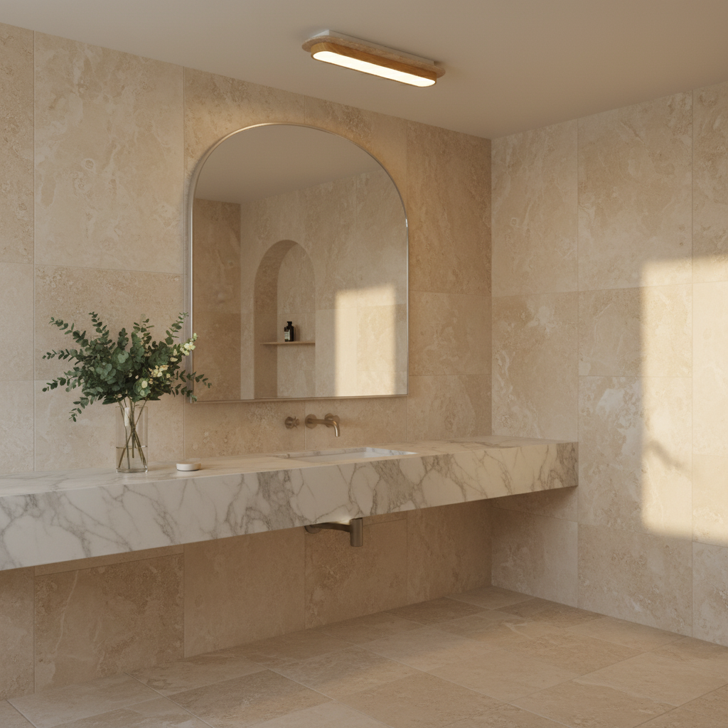 Thorne’s travertine surface and wood-toned frame create a soft architectural rhythm. Its glow carries a quiet warmth that enriches bedrooms and calm interiors with a refined organic presence.