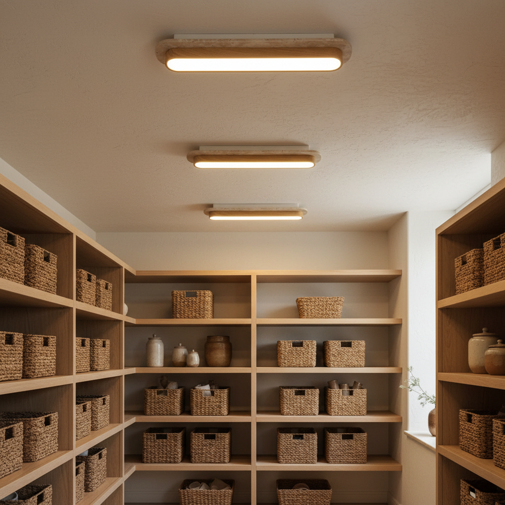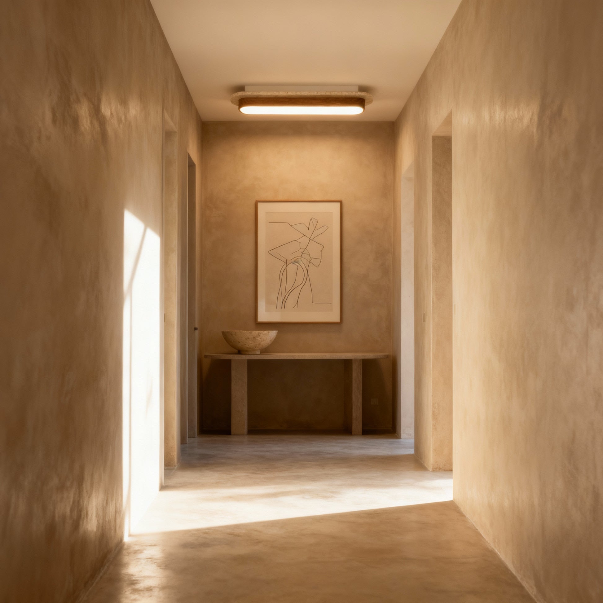 A ceiling light that unites travertine texture and wood-finish warmth for a serene, balanced expression of natural design.