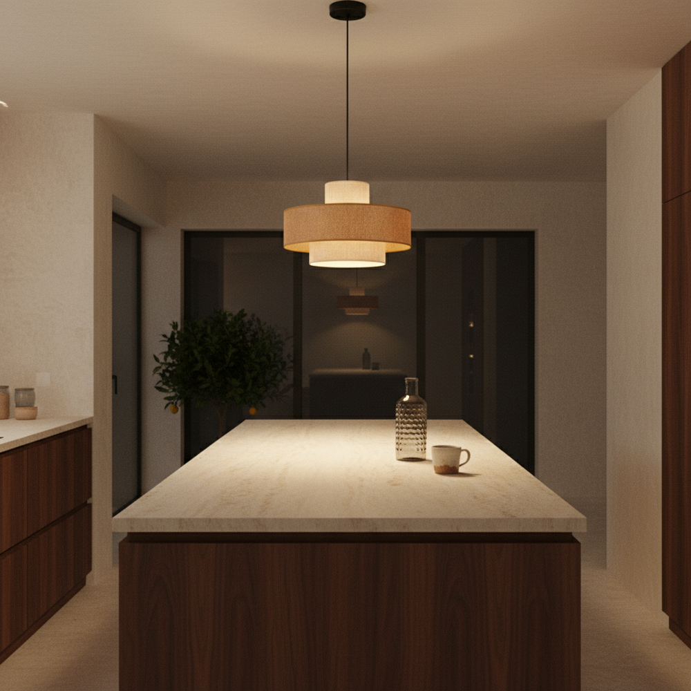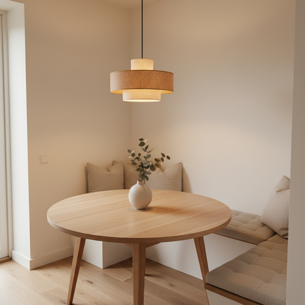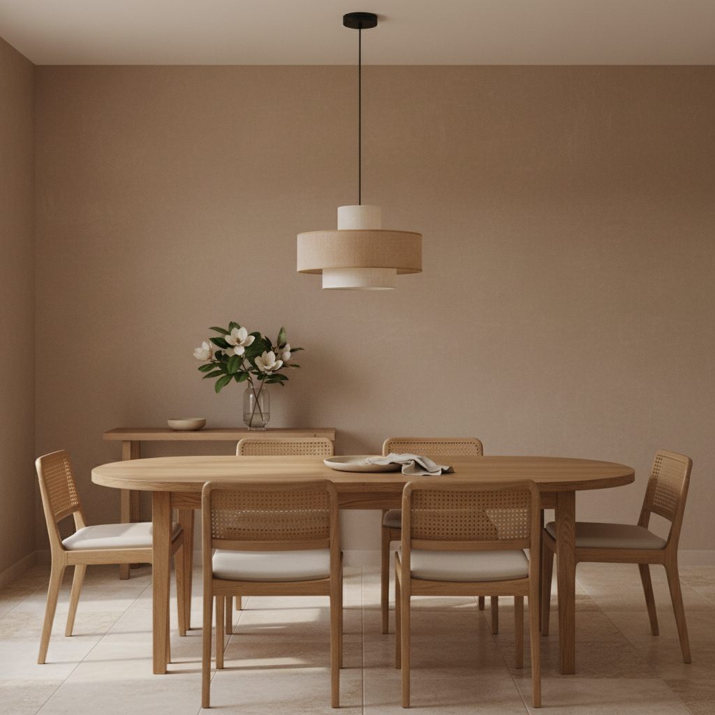 With its linen-inspired texture and tranquil proportion, Torin captures the quiet harmony of Japandi interiors. The dual shade diffuses a balanced glow that softens space, enriching moments of calm and presence.