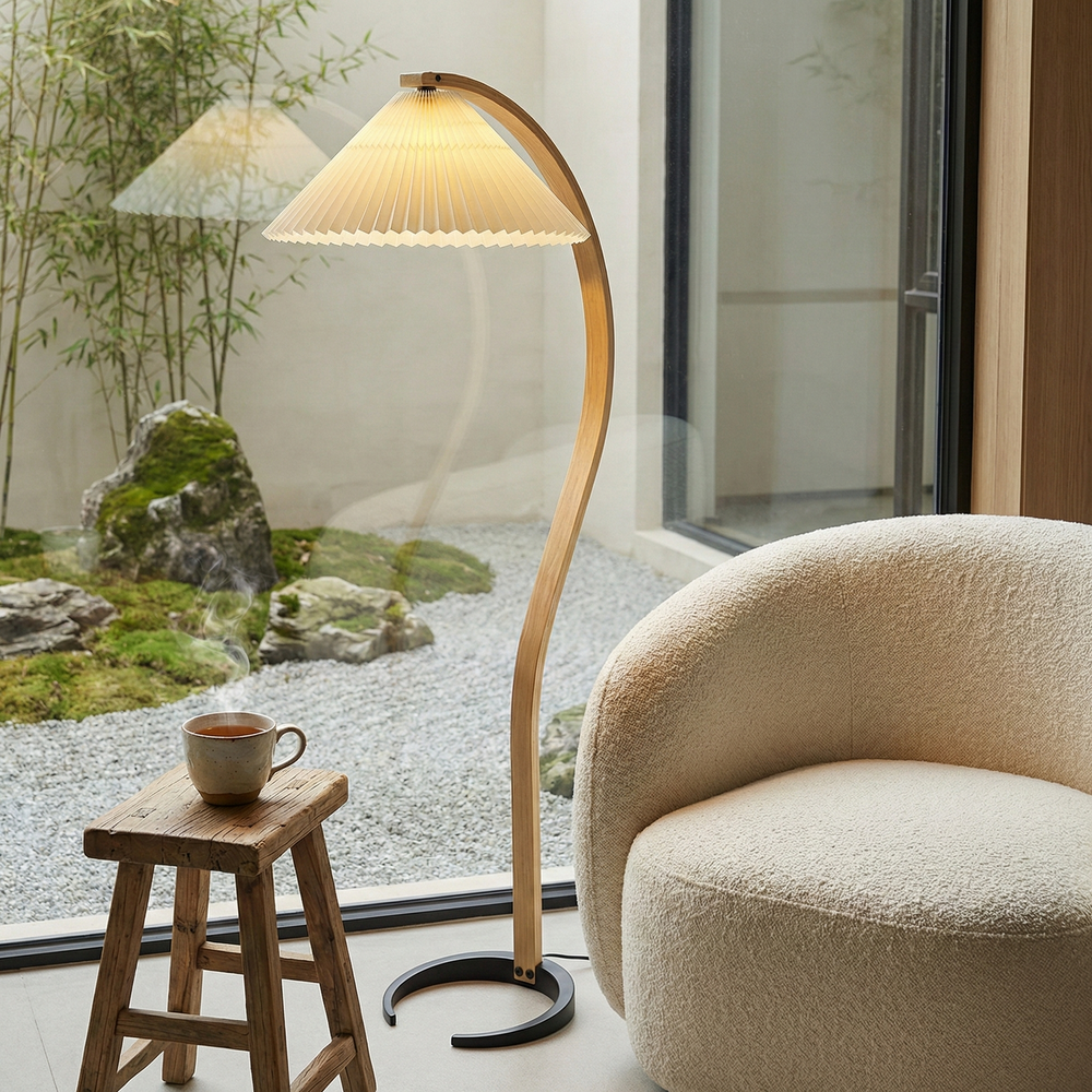 A gently curved floor lamp that balances natural materials with calm, ambient illumination for modern living spaces.