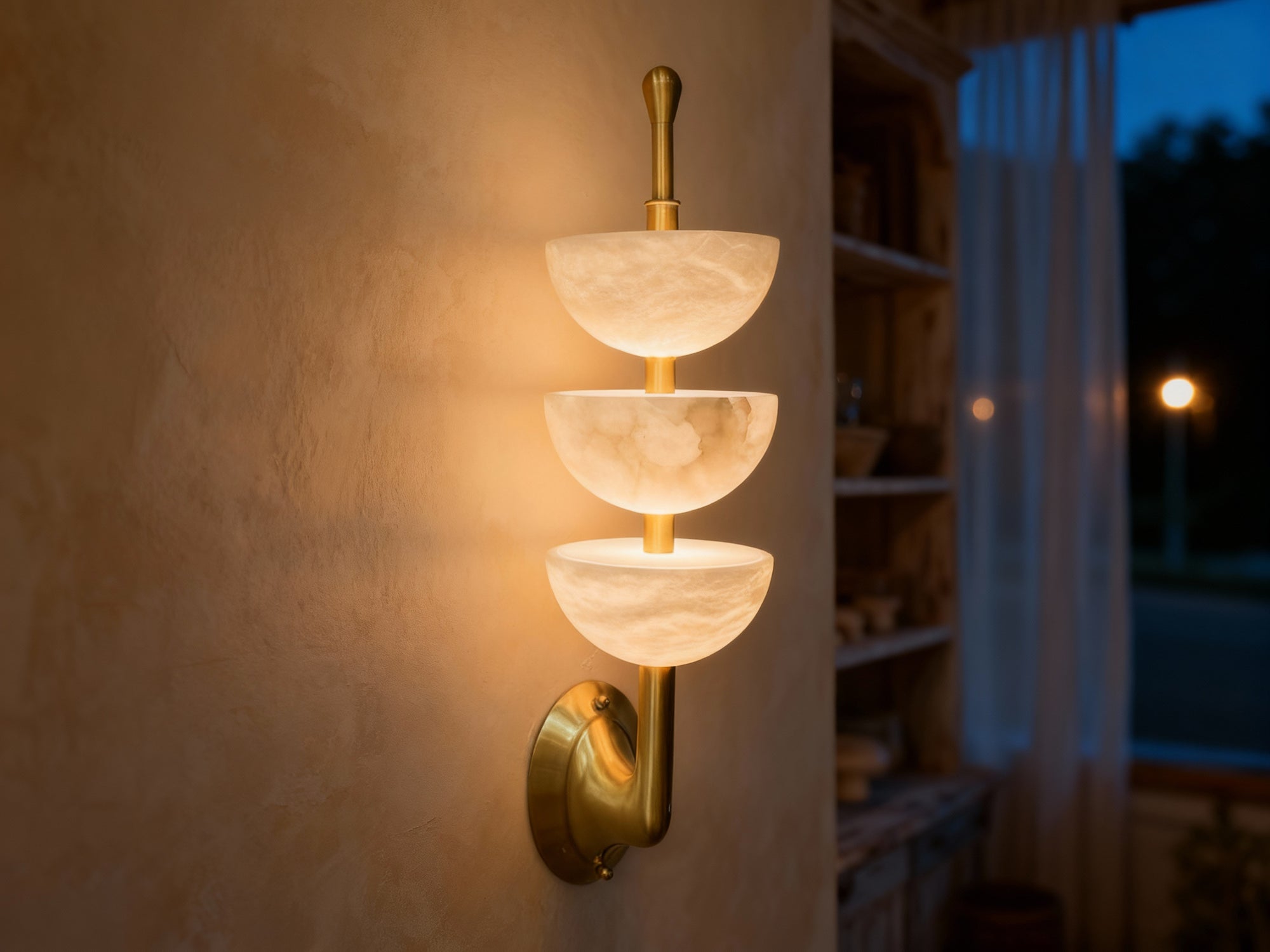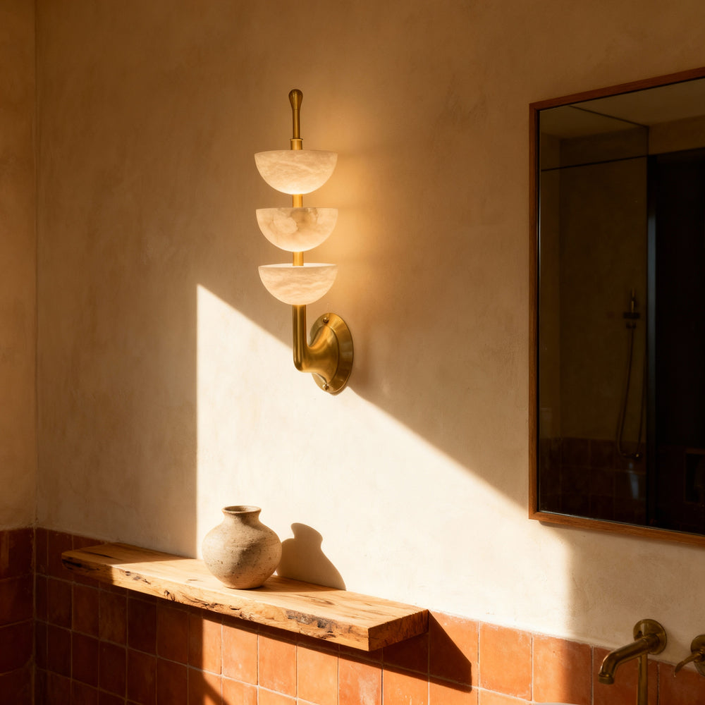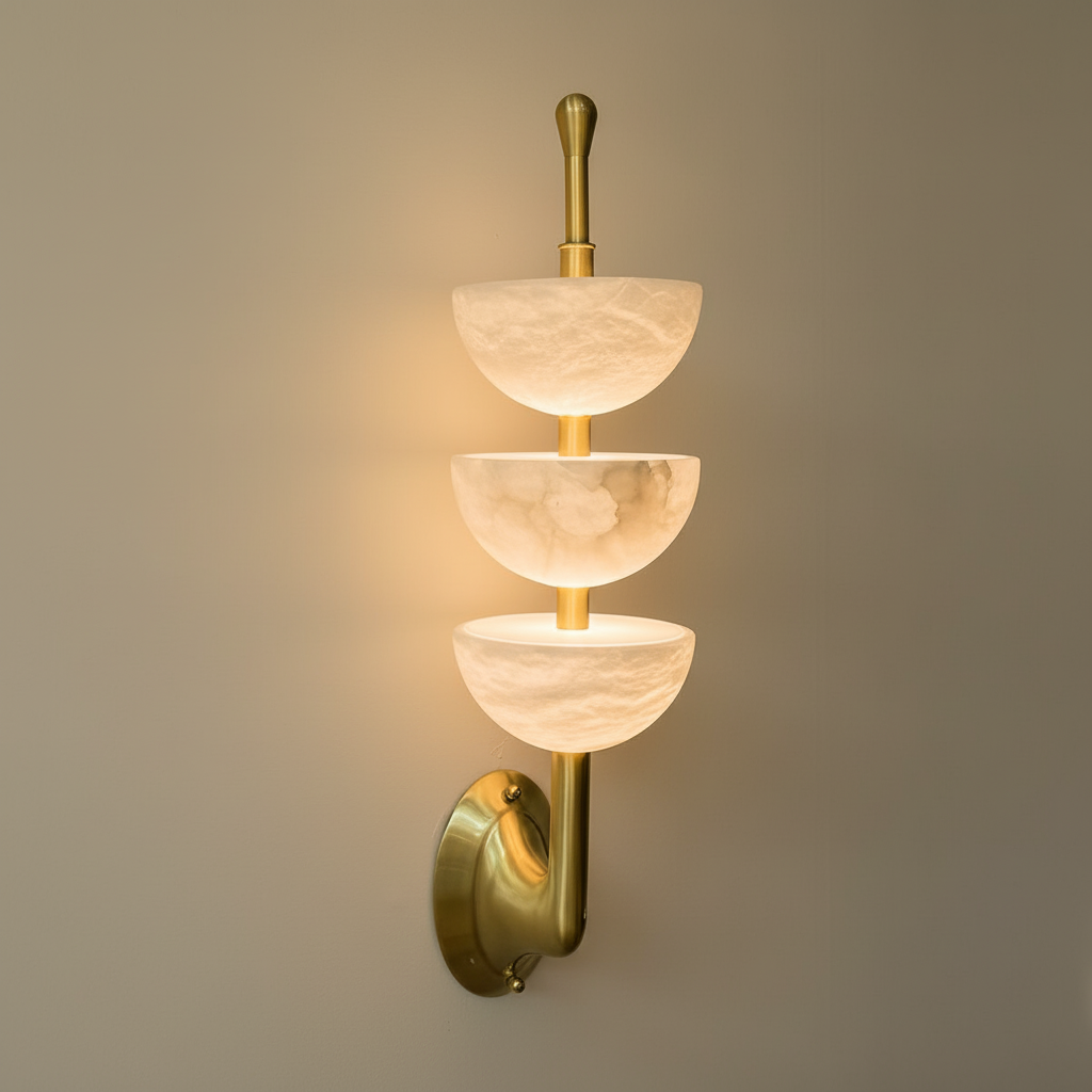 Three softly lit stone hemispheres stack vertically to create a serene architectural rhythm. Xara blends natural translucency with a warm metallic structure, offering a gentle visual anchor for hallways, living areas, and home workspaces.