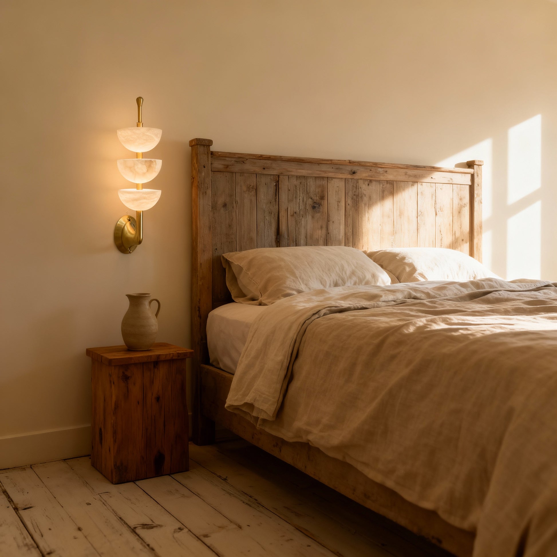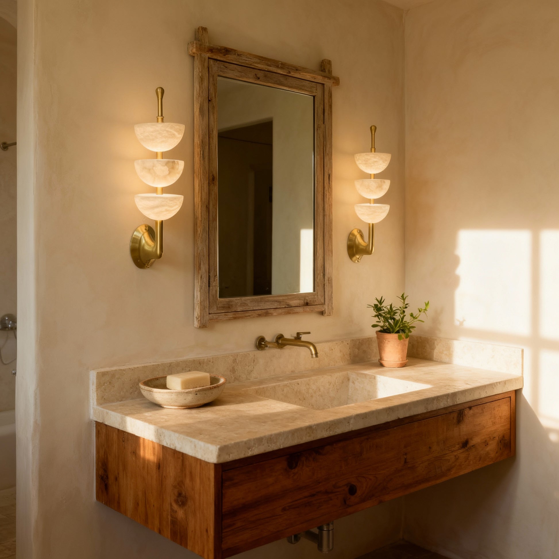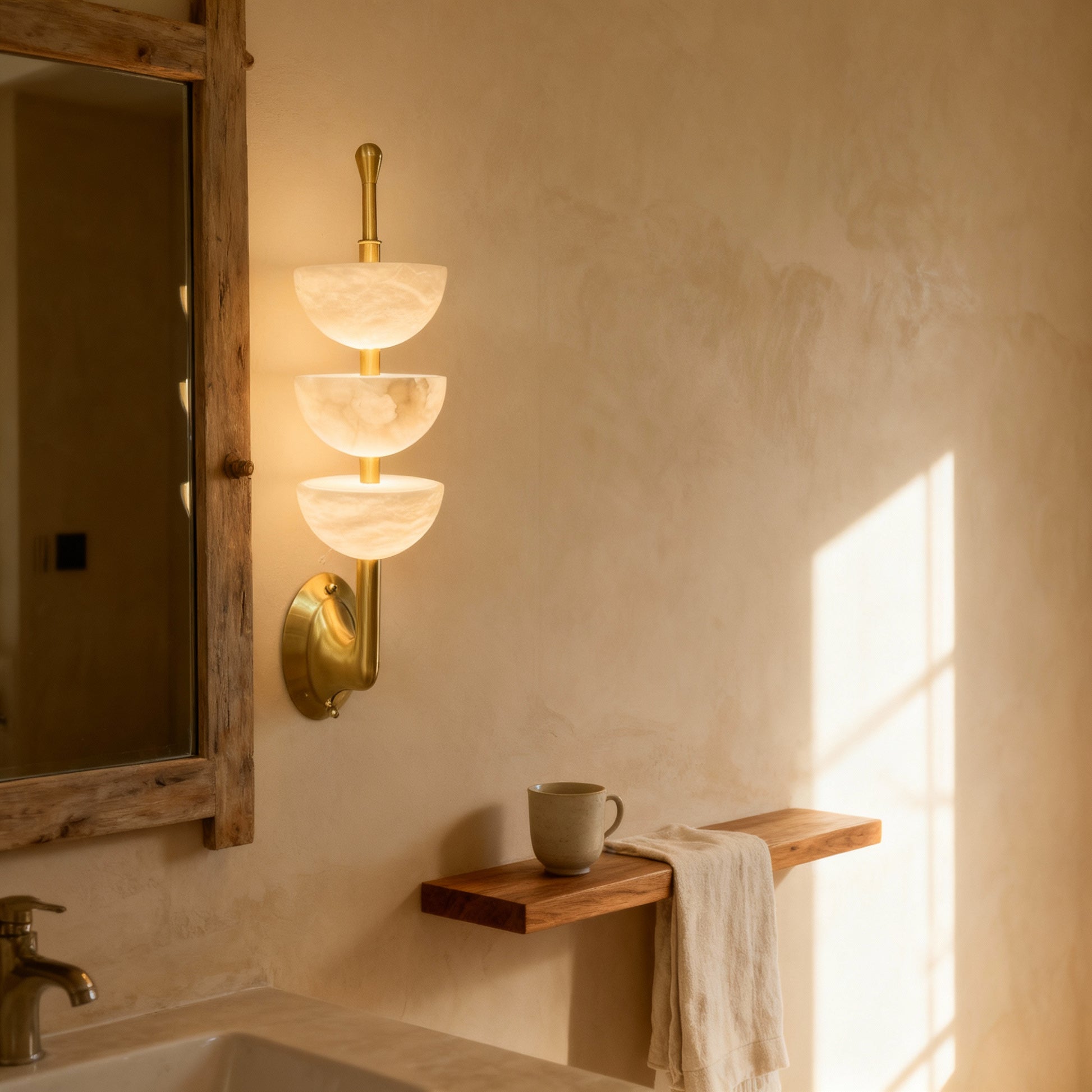 Three softly lit stone hemispheres stack vertically to create a serene architectural rhythm. Xara blends natural translucency with a warm metallic structure, offering a gentle visual anchor for hallways, living areas, and home workspaces.