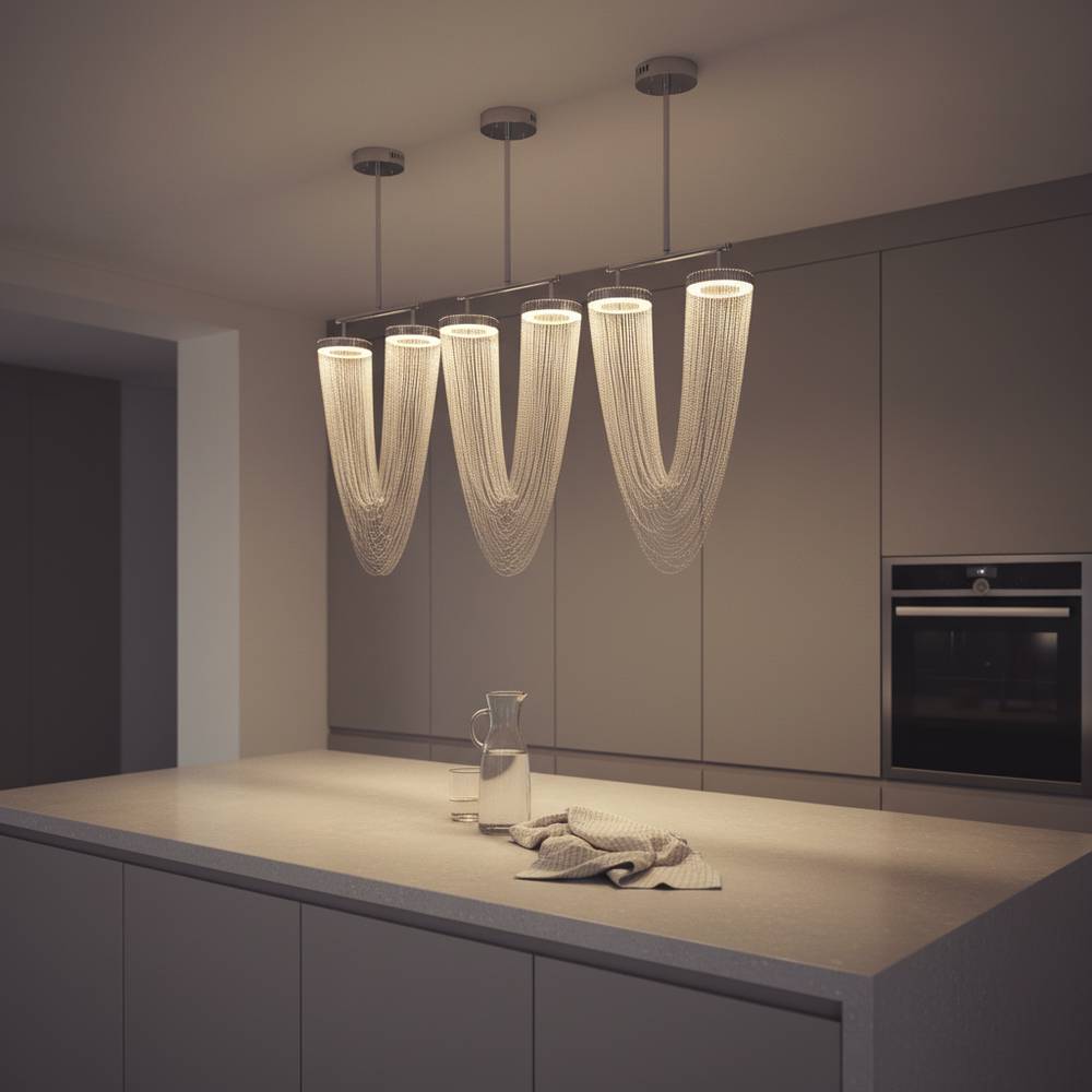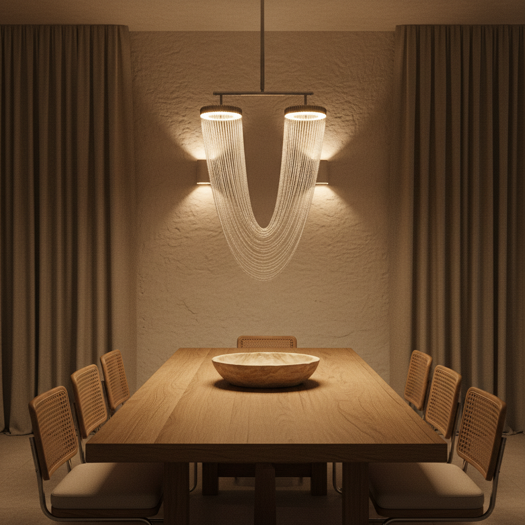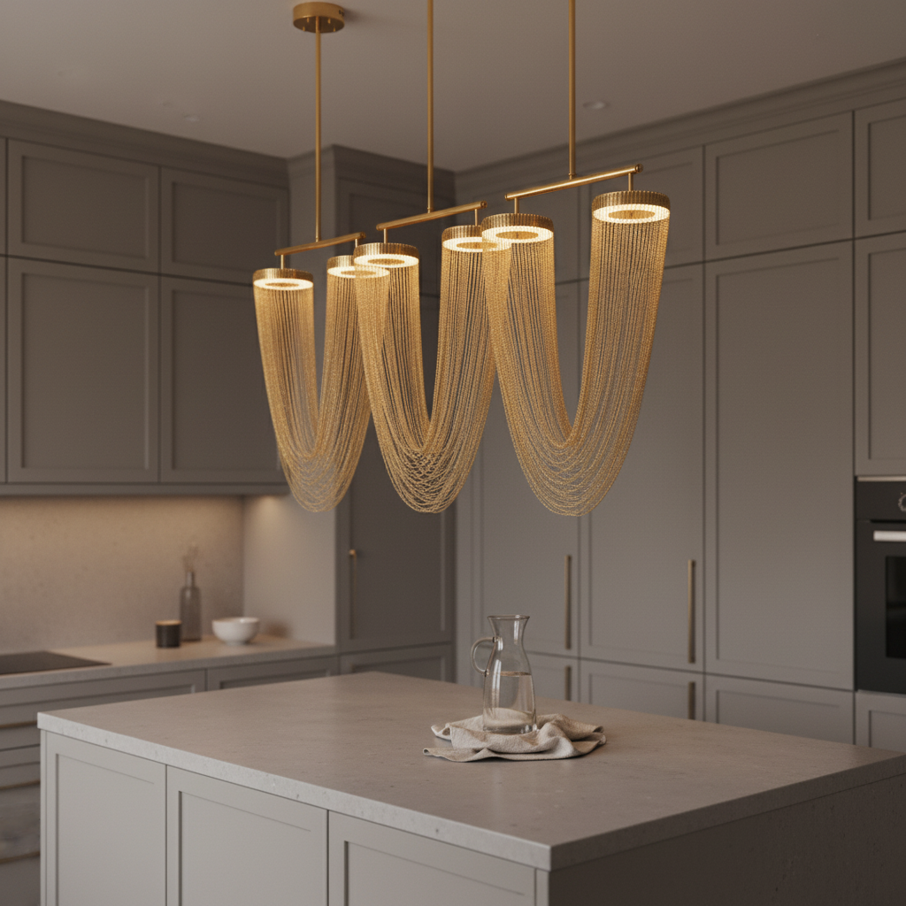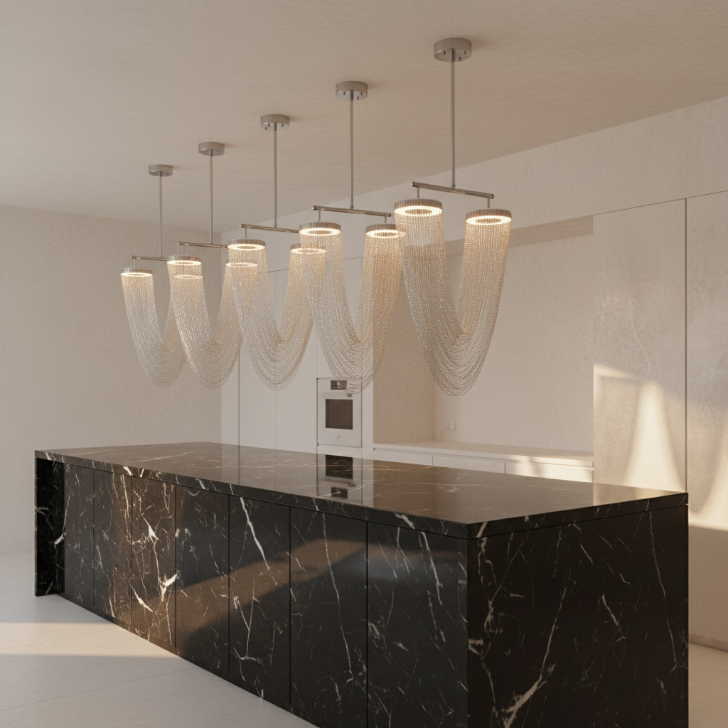 A statement chandelier defined by cascading chains and an elegant silhouette that radiates quiet sophistication.