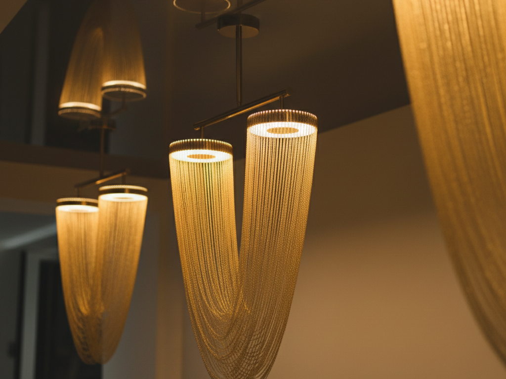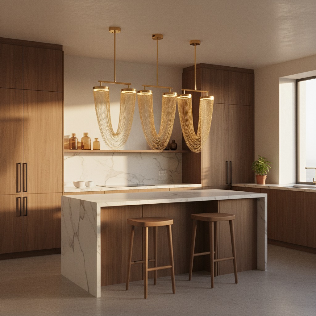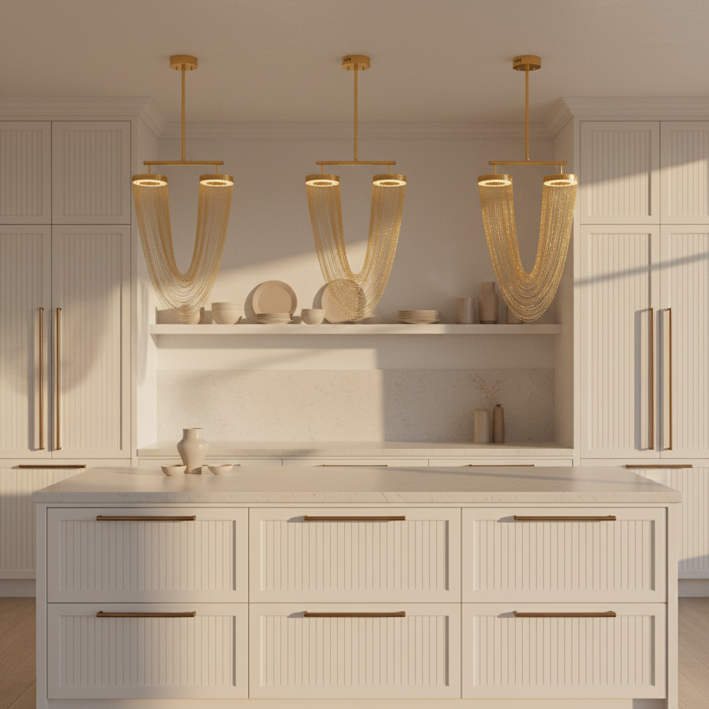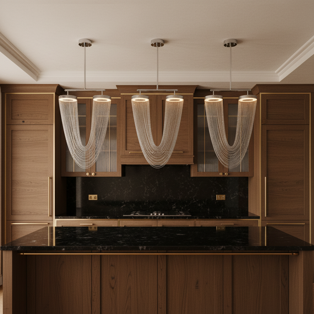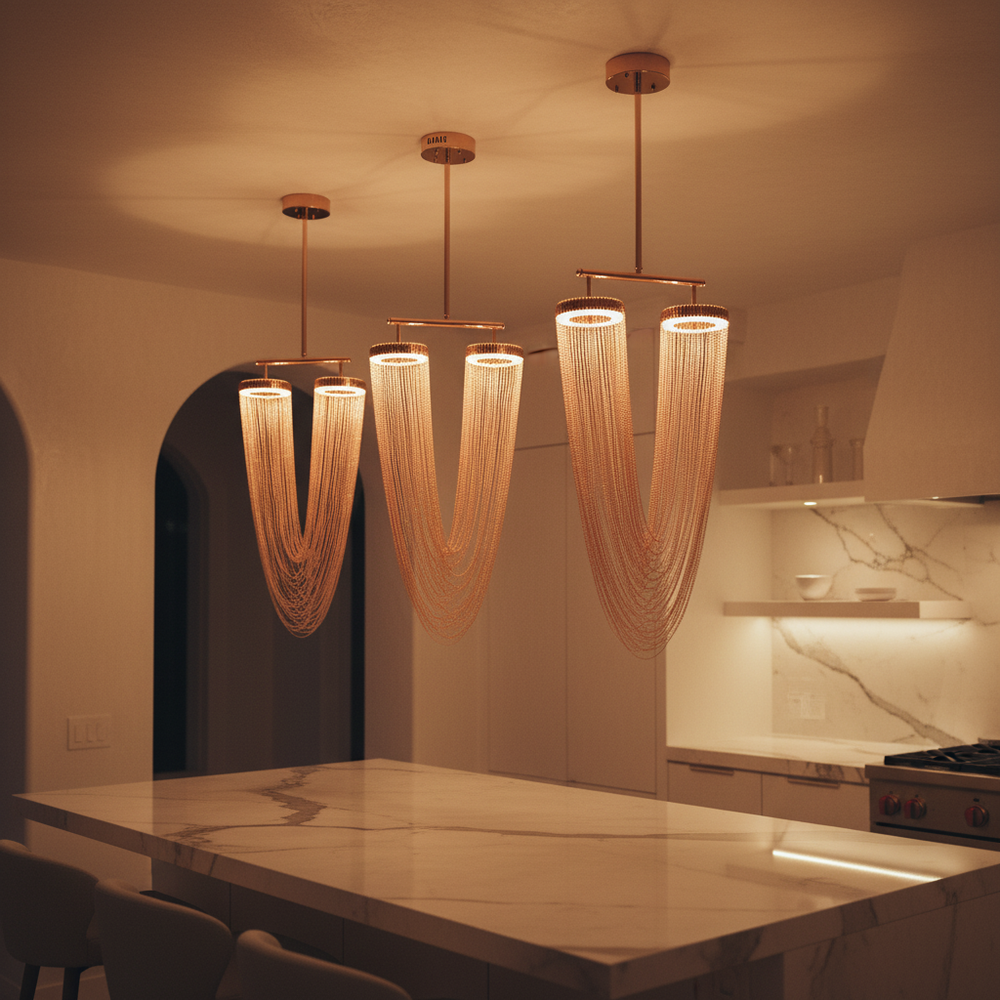 A statement chandelier defined by cascading chains and an elegant silhouette that radiates quiet sophistication.