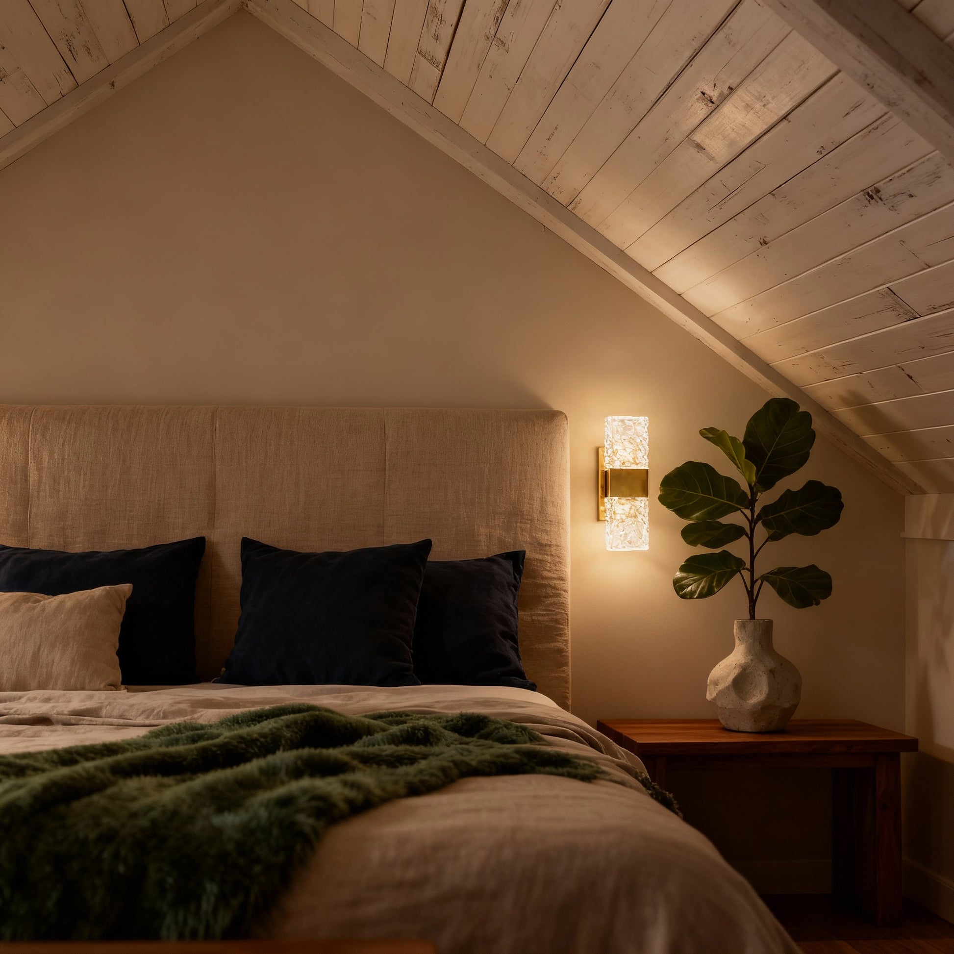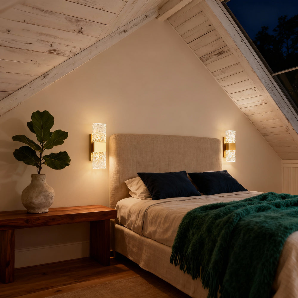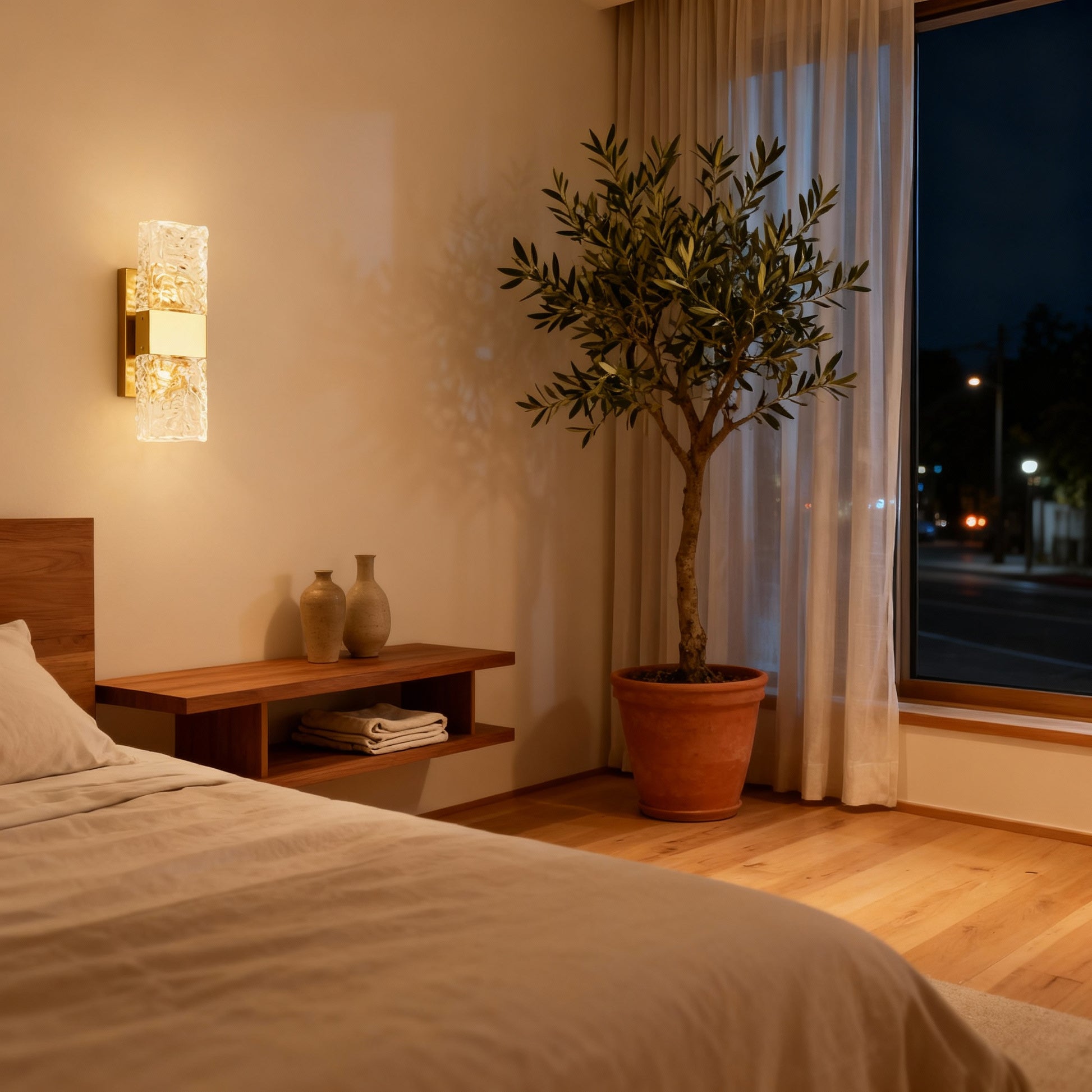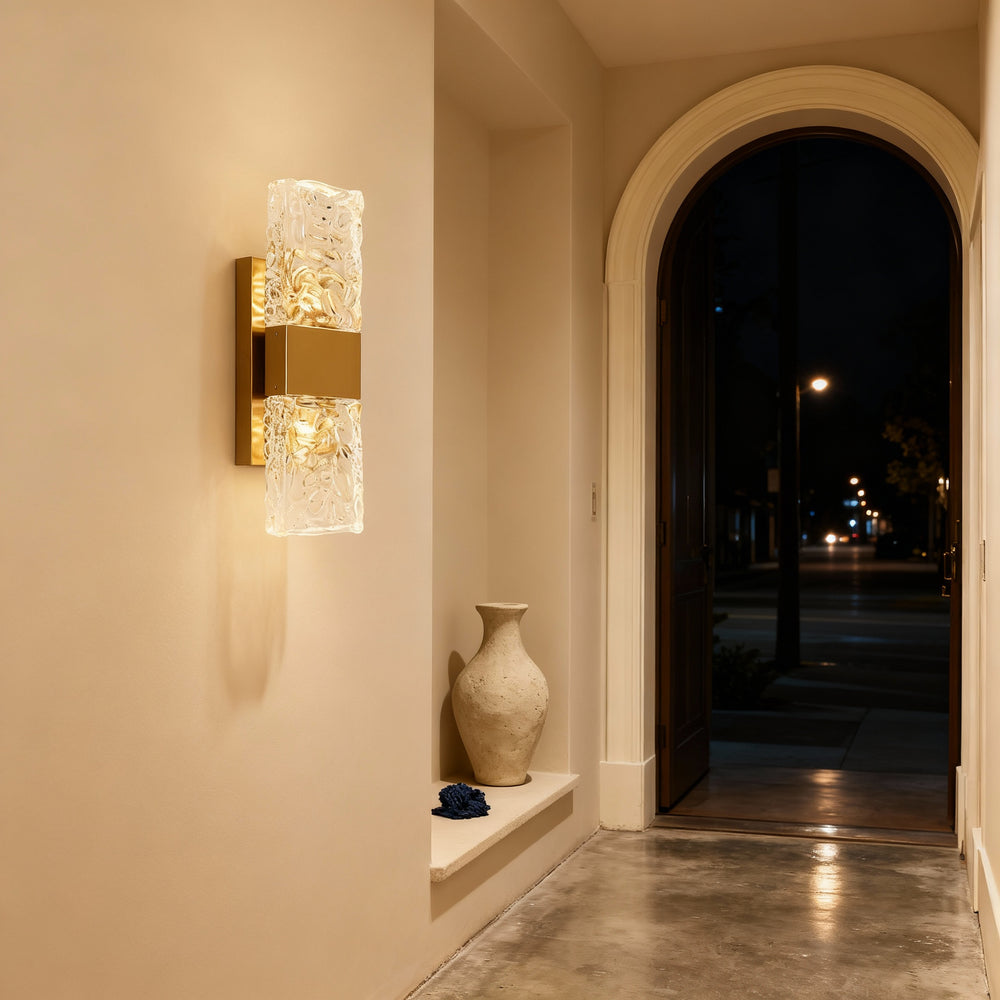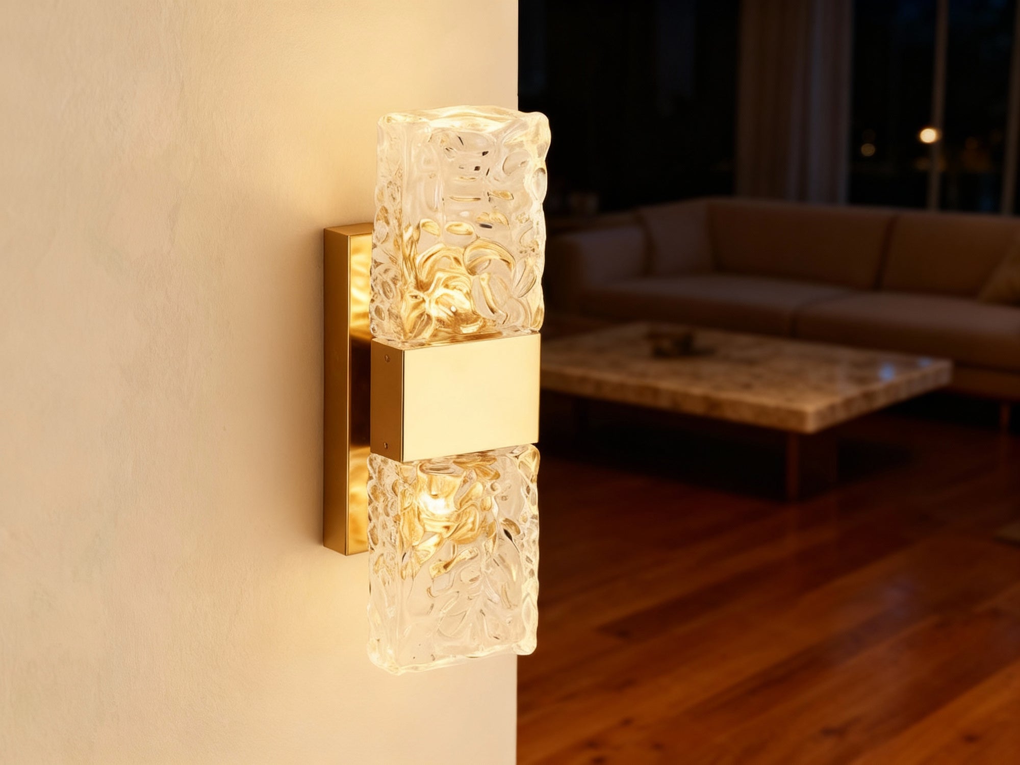 An elegant wall light defined by sculpted glass and a warm ambient presence that enriches modern interiors.